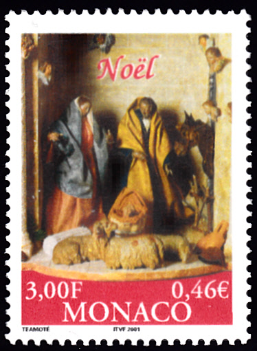 Auf dieser Weihnachtsmarke aus dem Jahre 2000 aus Monaco (MiNr 2525) wird ein Detail aus einer Neapolitanische Weihnachtskrippe aus dem 18. Jahrhundert aus dem Nationalmuseum gezeigt.