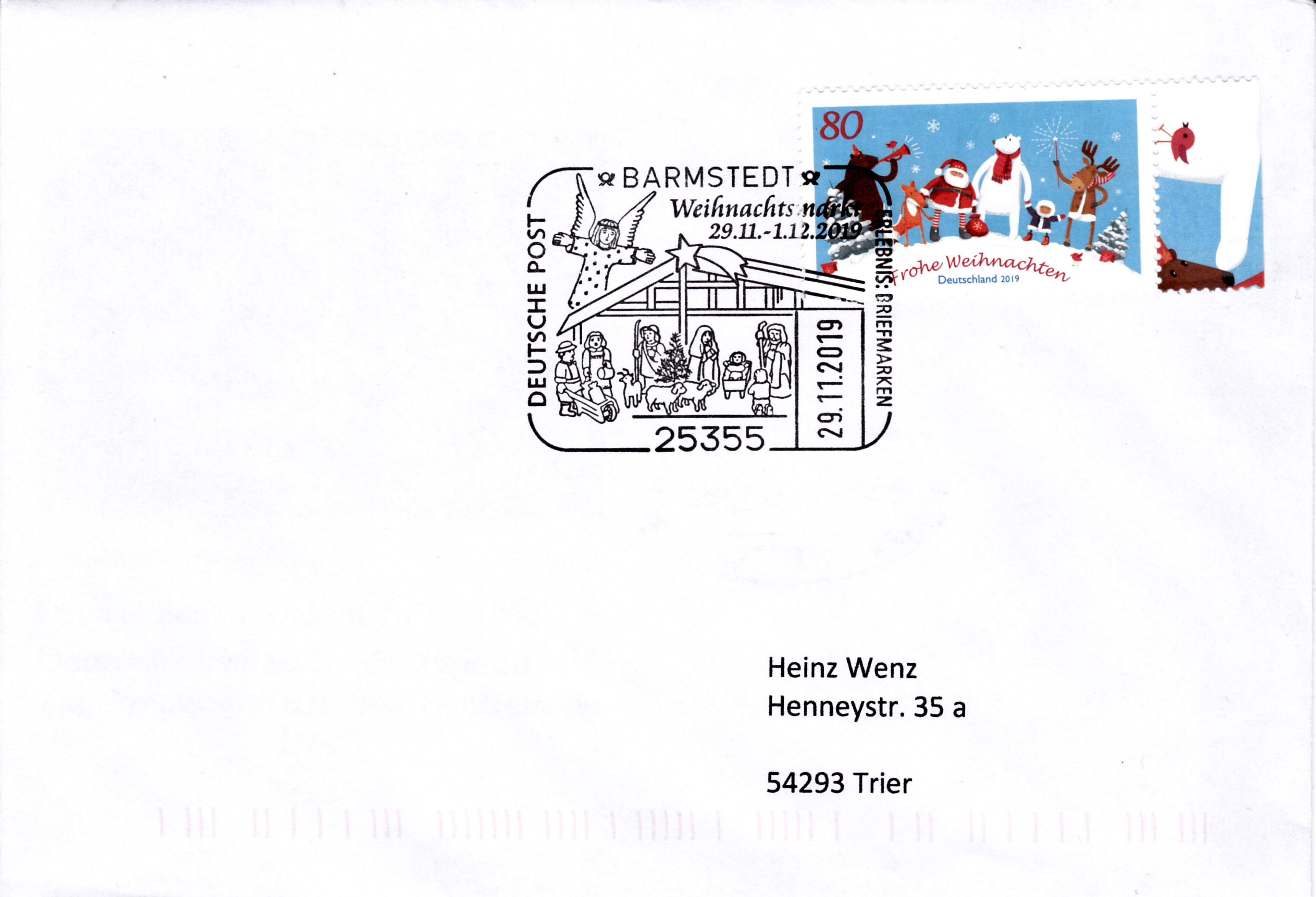 Im Sonderstempel von 29.11.2019 aus Barmstedt zum Weihnachtsmarkt 2019(29.11.-1.12.2019) wird ein Krippenbild aus der Heiligen-Geist-Kirche in Barmstedt gezeigt.