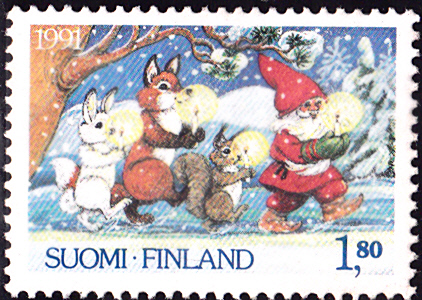 Aus Finnland kommt auch diese Weihnachtsmarke 1991 (MiNr 1159) aus dem Jahr 1990. Sie zeigt den Weihnachtsmann und Tiere mit Kerzen.