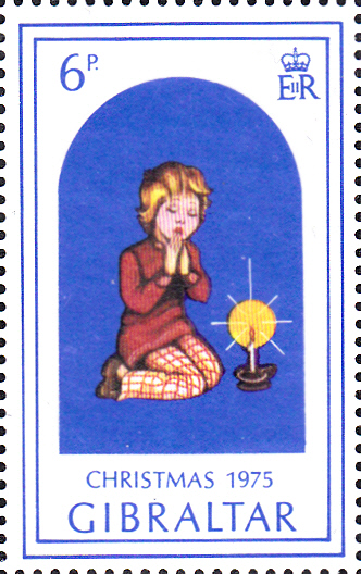 Aus der gleichen Serie kommt diese Marke (MiNr 332) mit einem betenden Kind und einer Kerze.