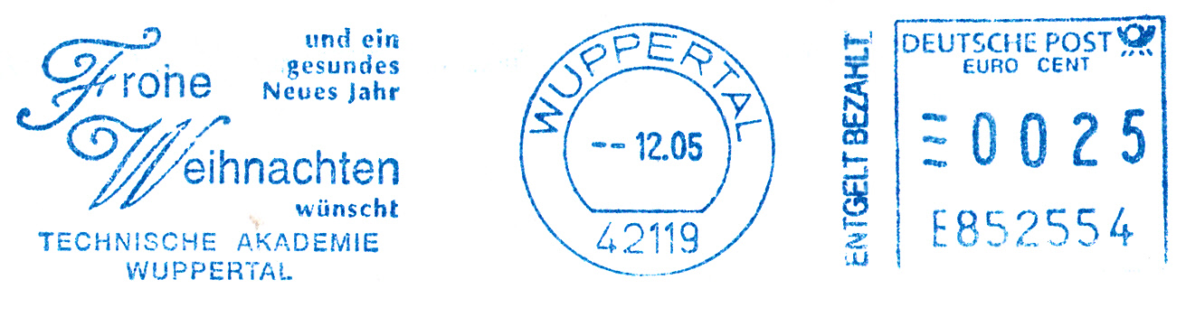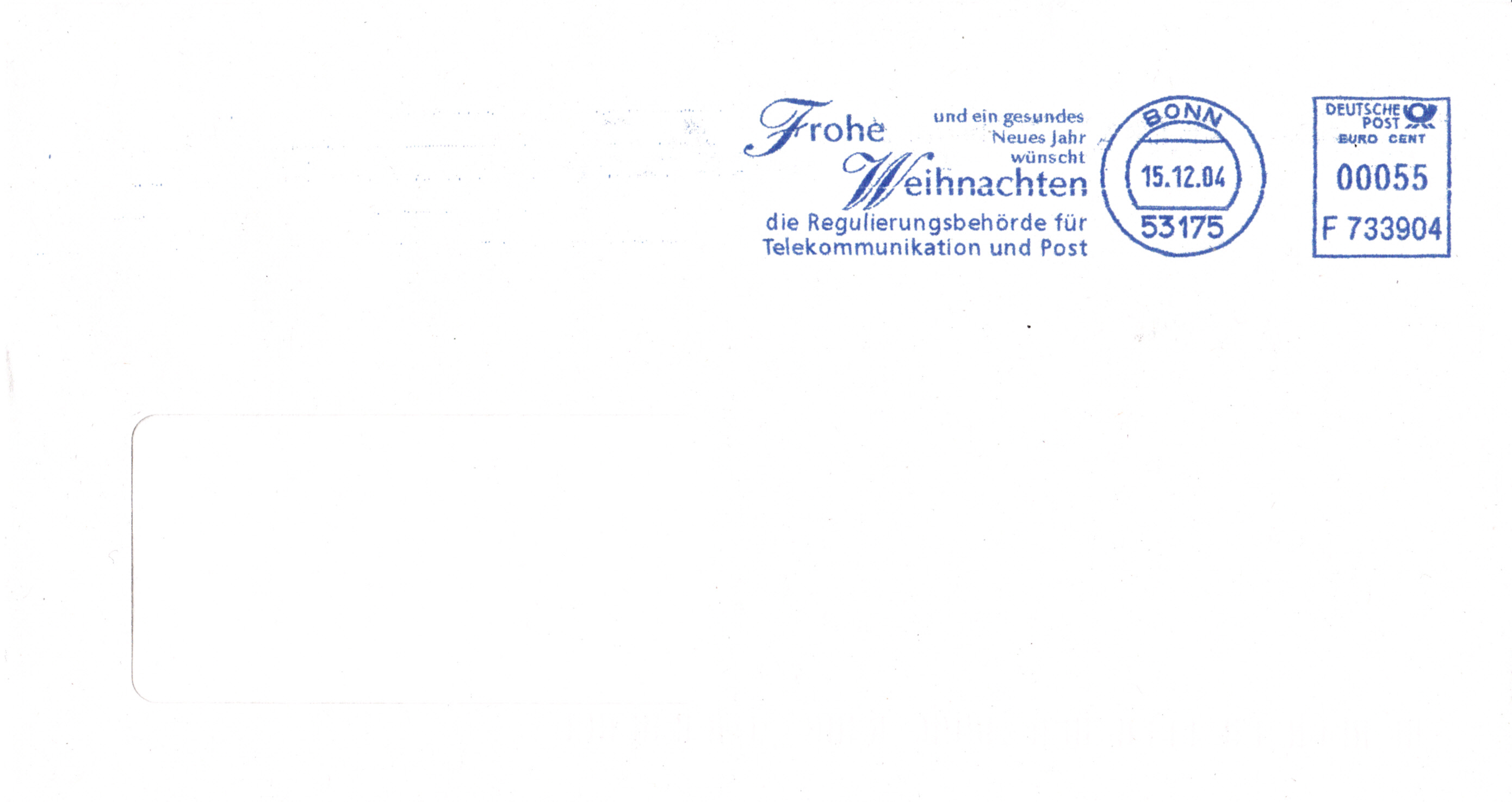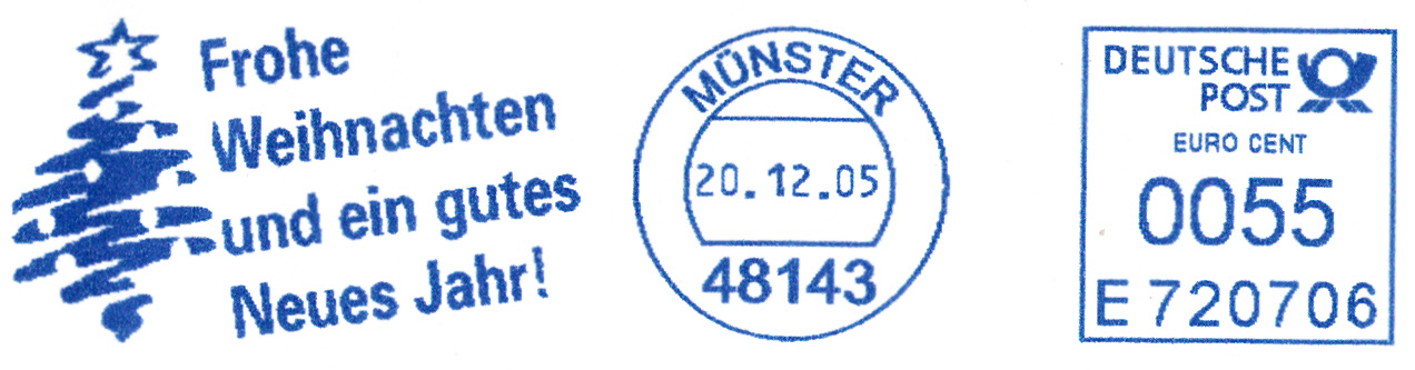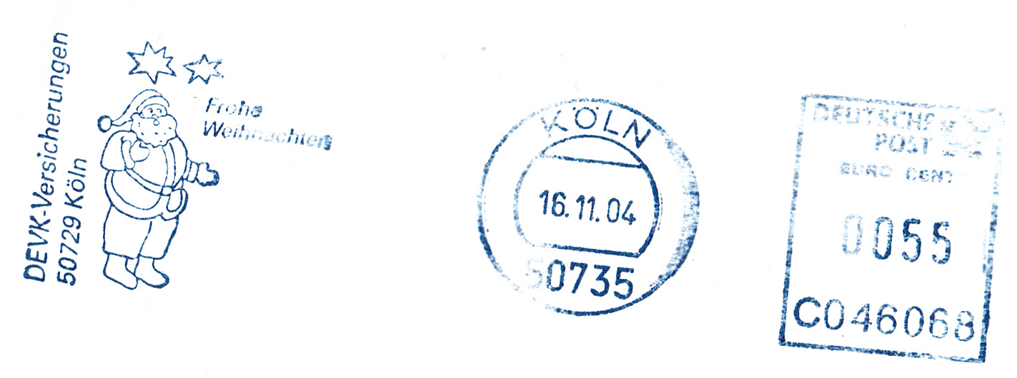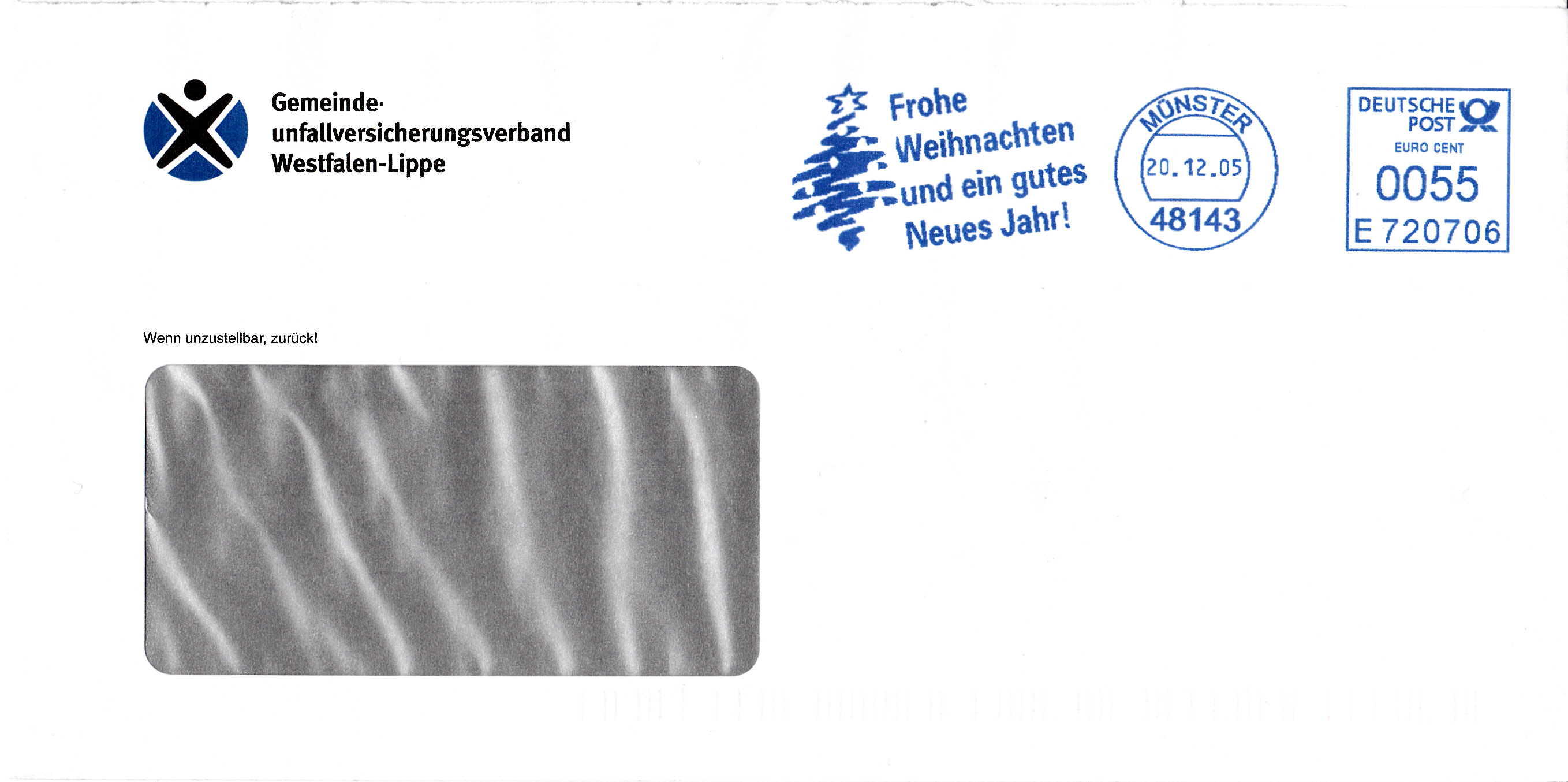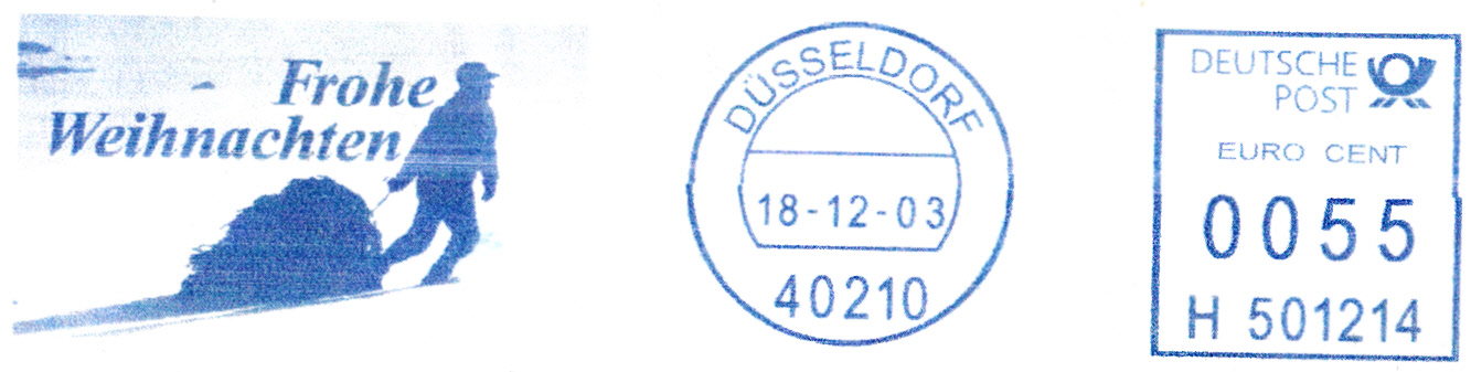 Absenderfreistempel aus Düsseldorf vom 18.12.2003 mit dem Wunsch "Frohe Weihnachten" und einem Mann, der einen Weihnachtsbaum "transportiert". Der Umschlag ist übrigens aus "direkt recyceltem Papier": er wurde aus nicht mehr aktuellen Landkarten hergestellt (rückseitiger Vermerk).