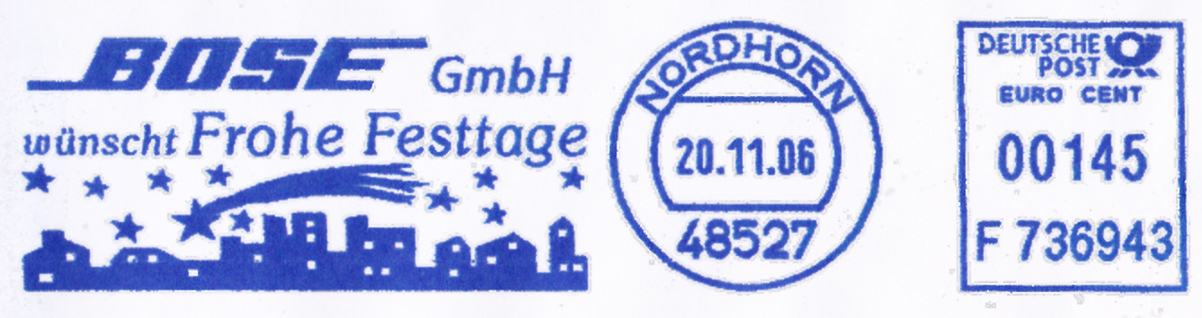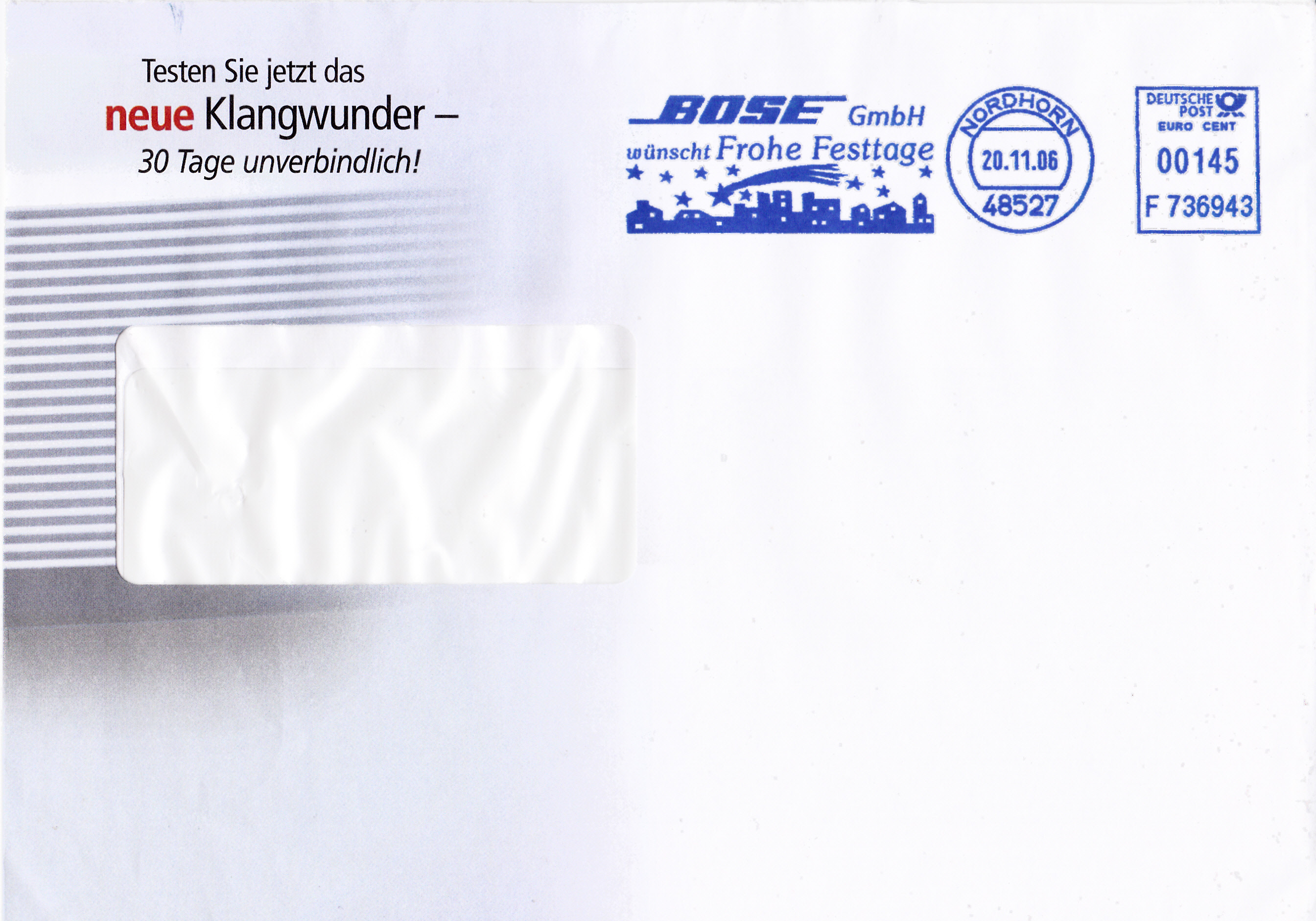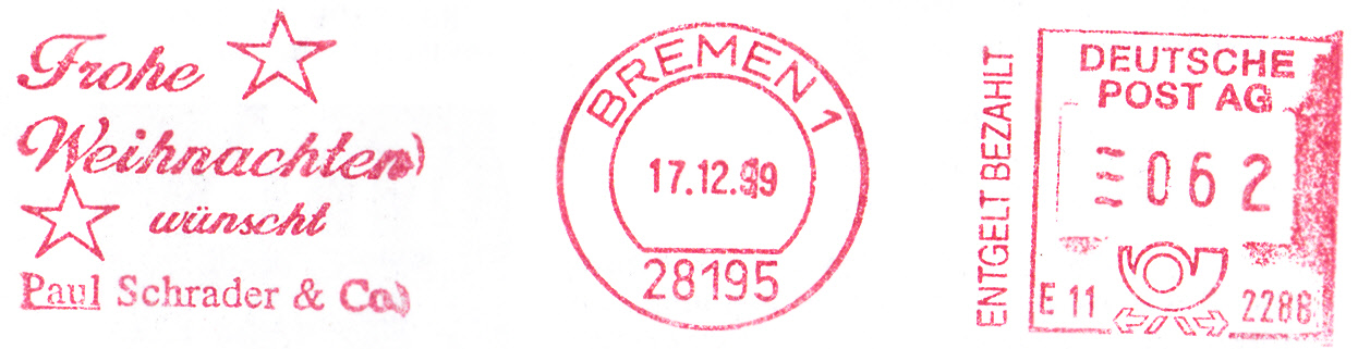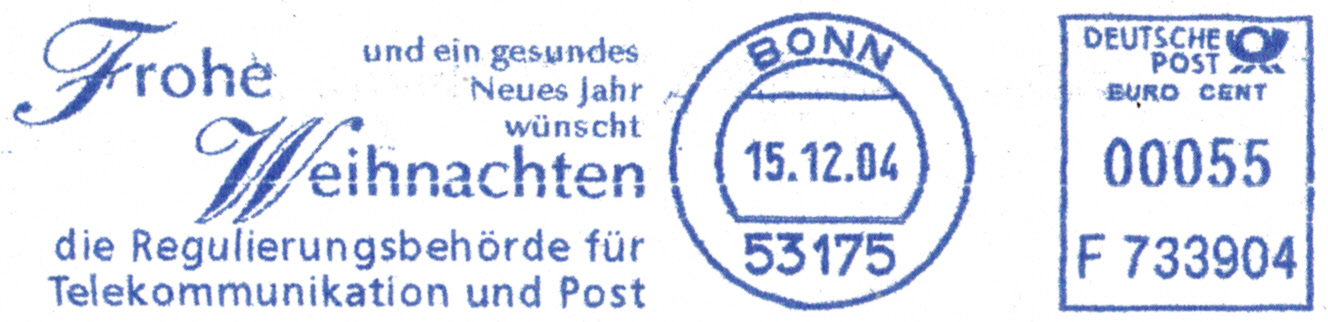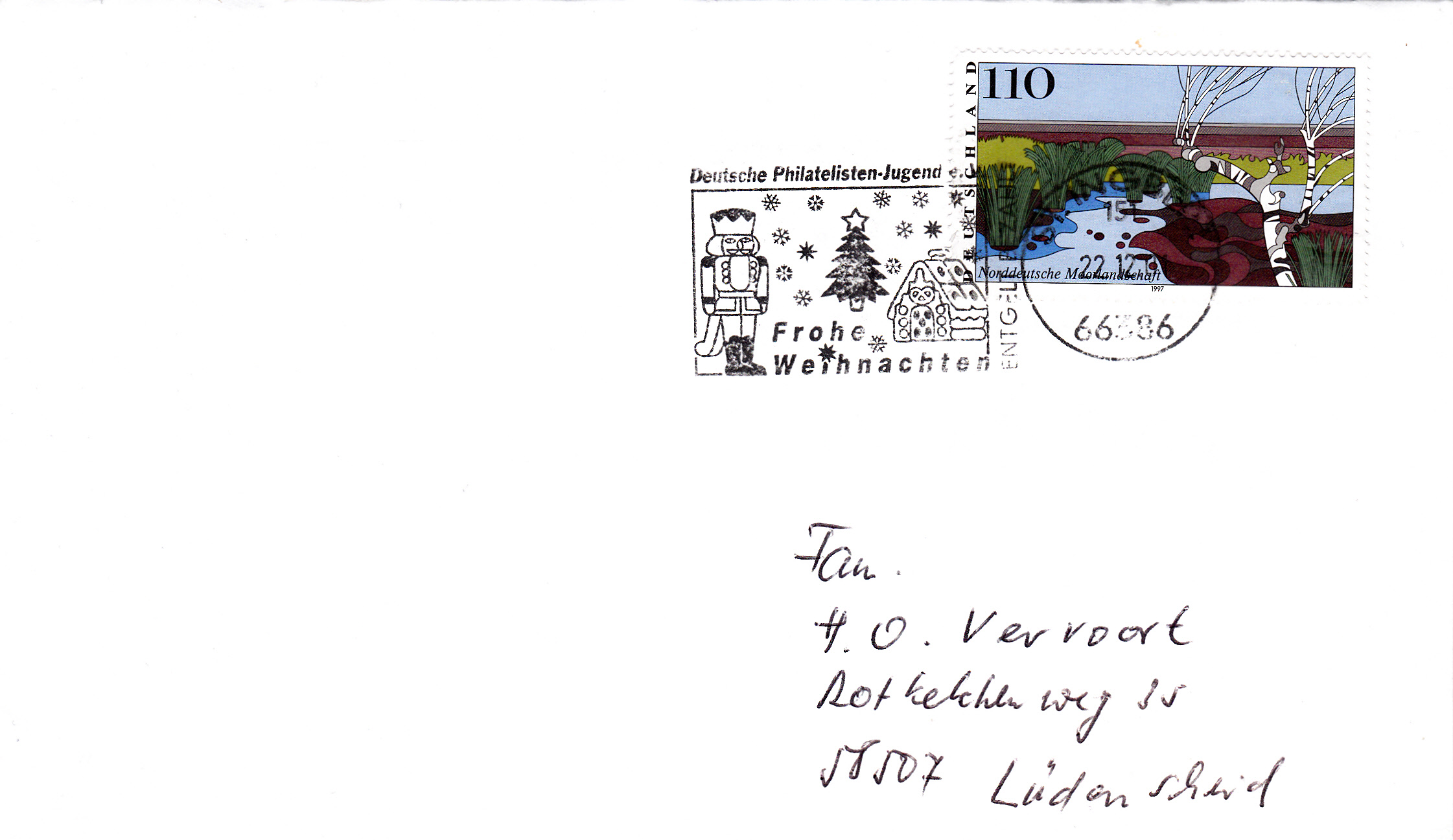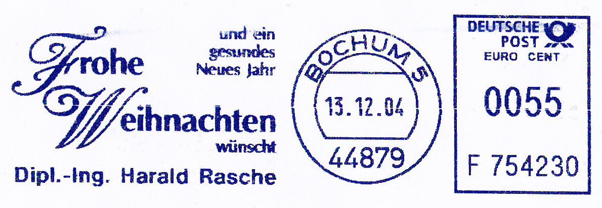 Absenderfreistempel aus Düsseldorf vom 18.12.2003 mit dem Wunsch "Frohe Weihnachten" und einem Mann, der einen Weihnachtsbaum "transportiert". Der Umschlag ist übrigens aus "direkt recyceltem Papier": er wurde aus nicht mehr aktuellen Landkarten hergestellt (rückseitiger Vermerk).
