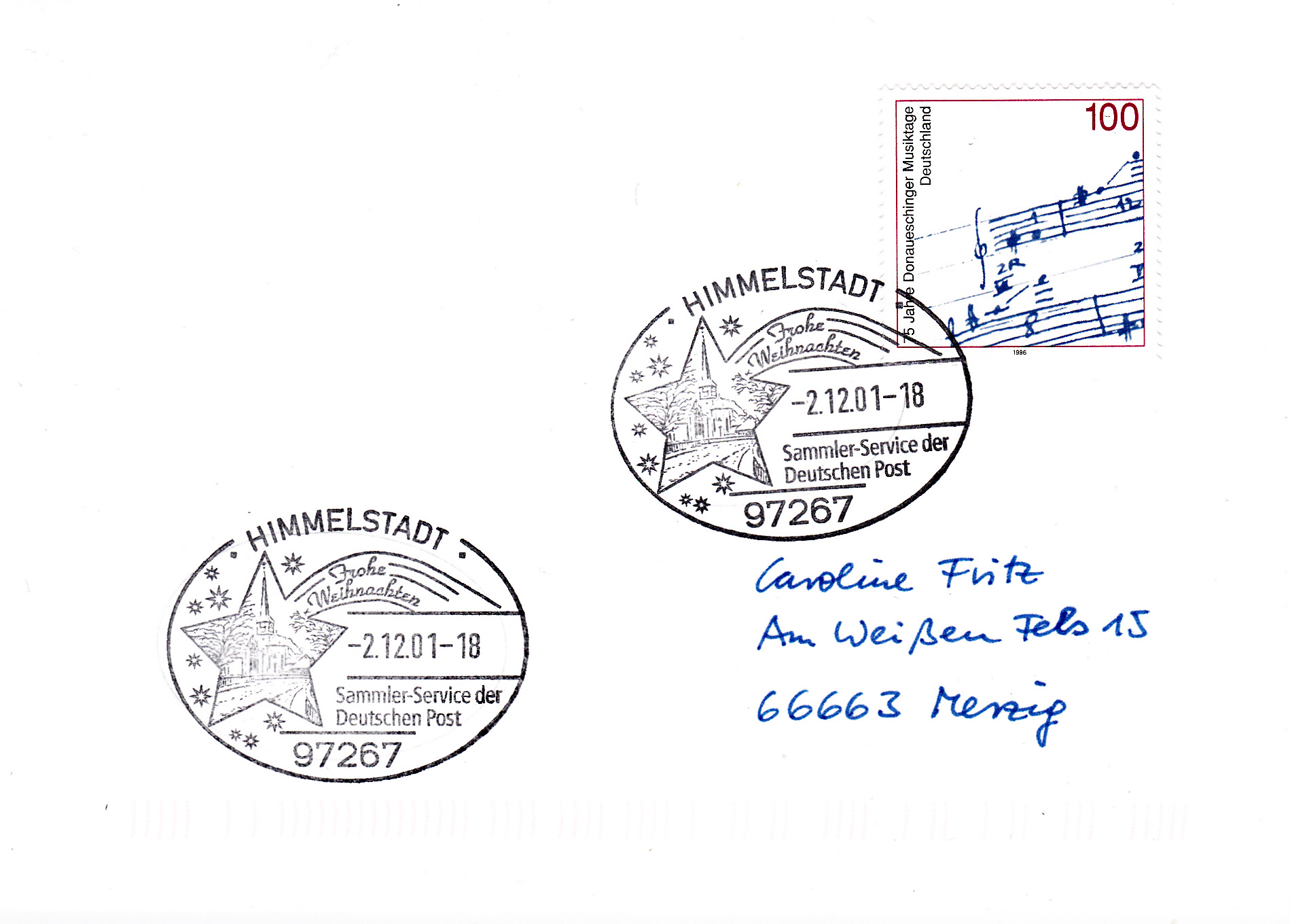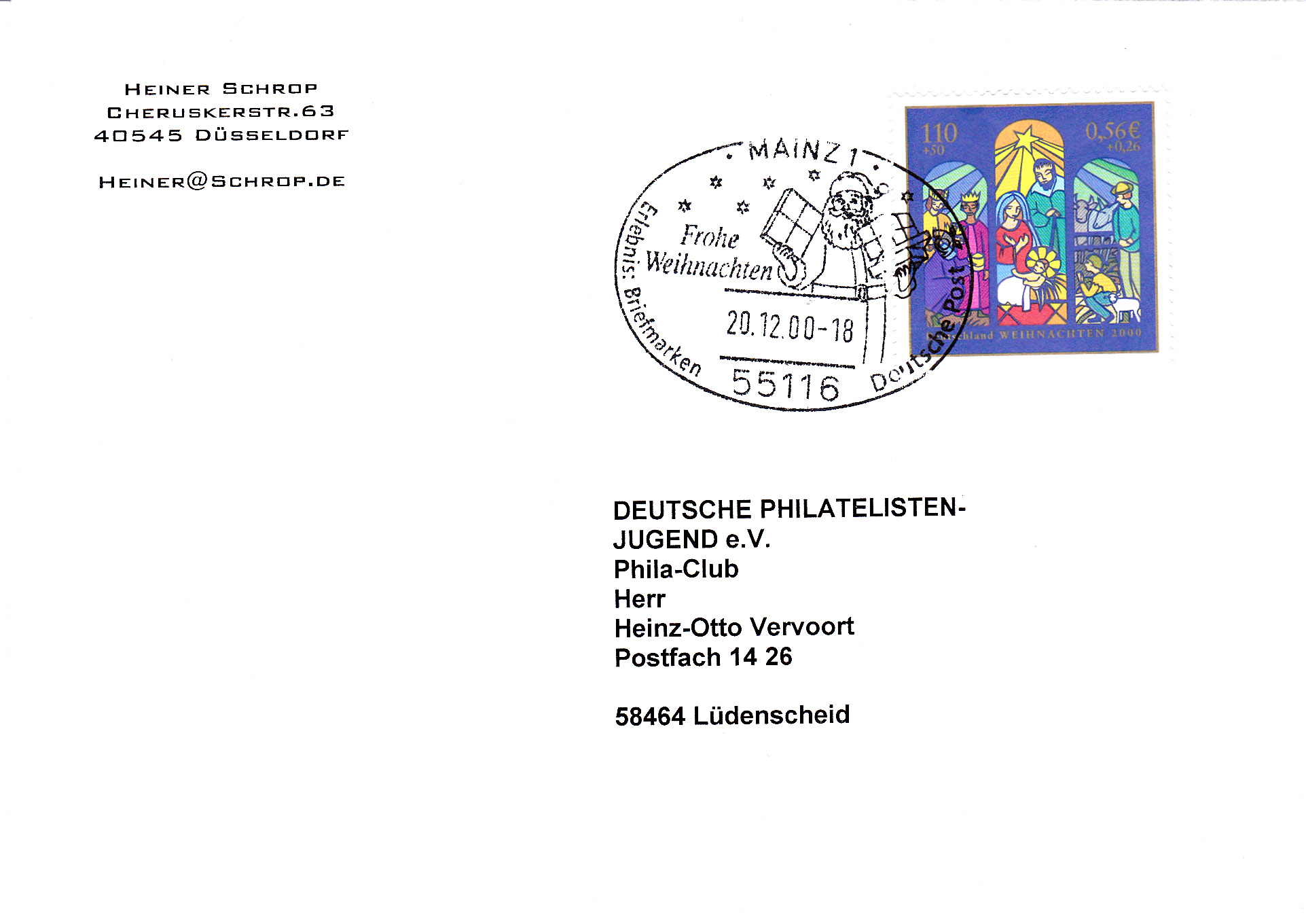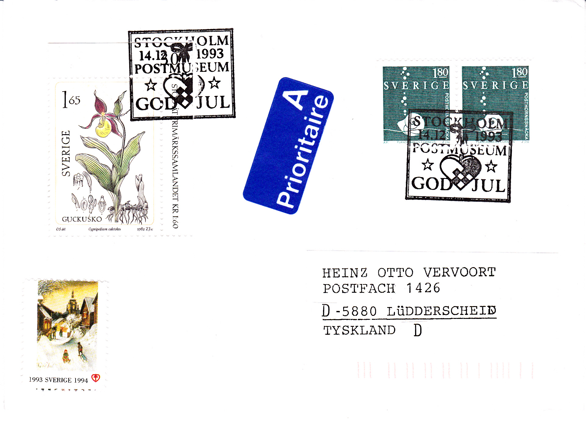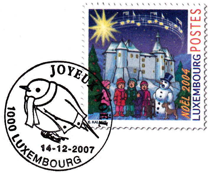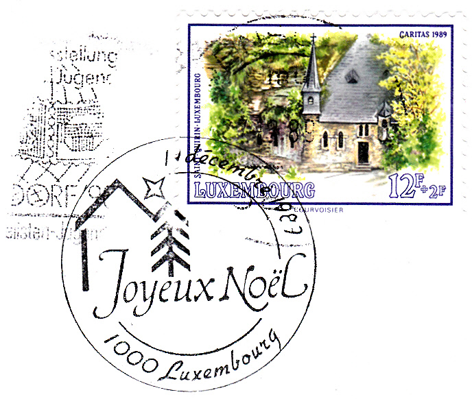 Auch in diesem Stempel vom 19.12.1989 aus Luxemburg können wir Weihnachtswünschen in französisch lesen. Die Fragmente eines Maschinenwerbestempels aus Lüdenscheid verderben allerdings den Beleg.