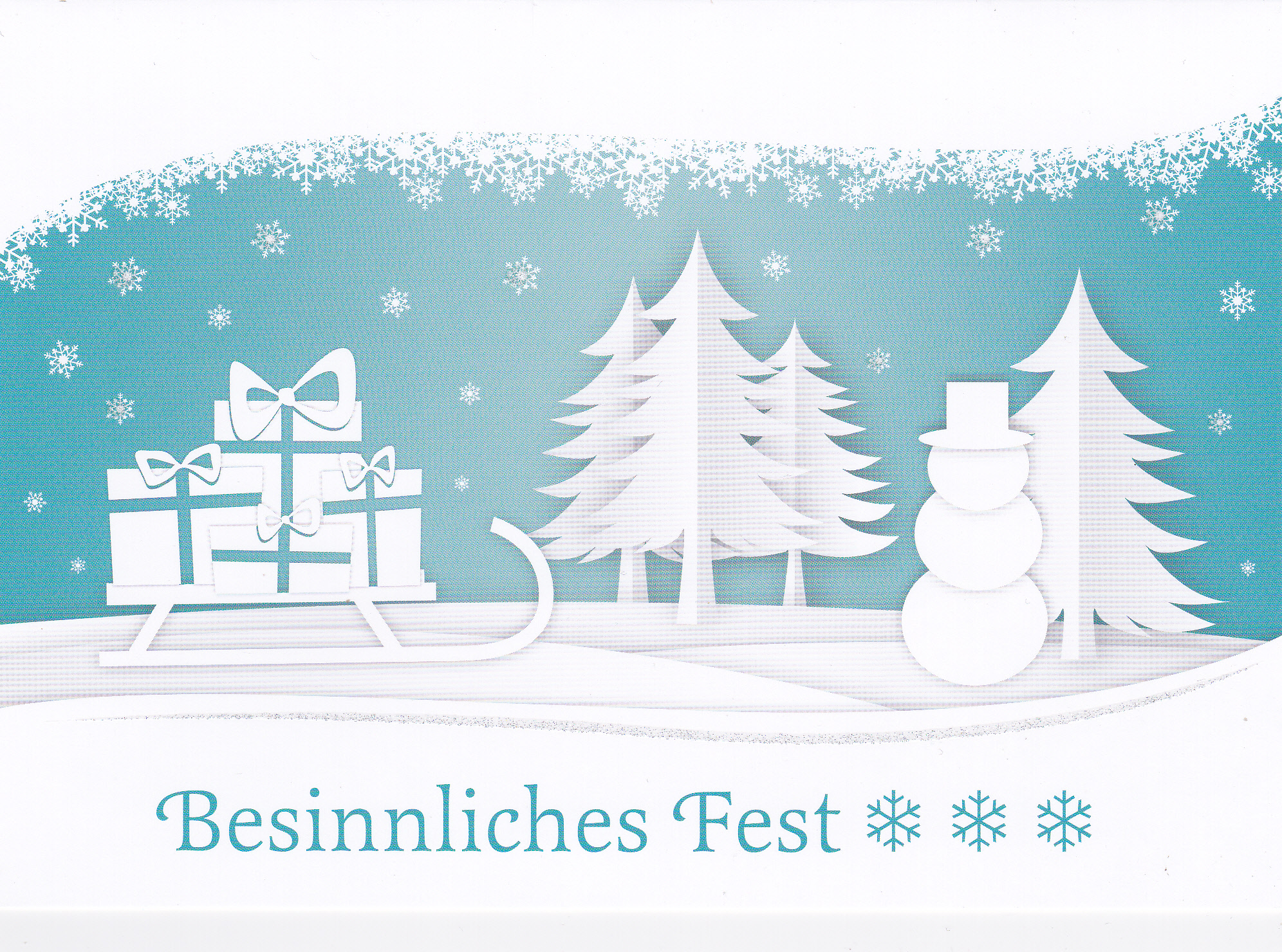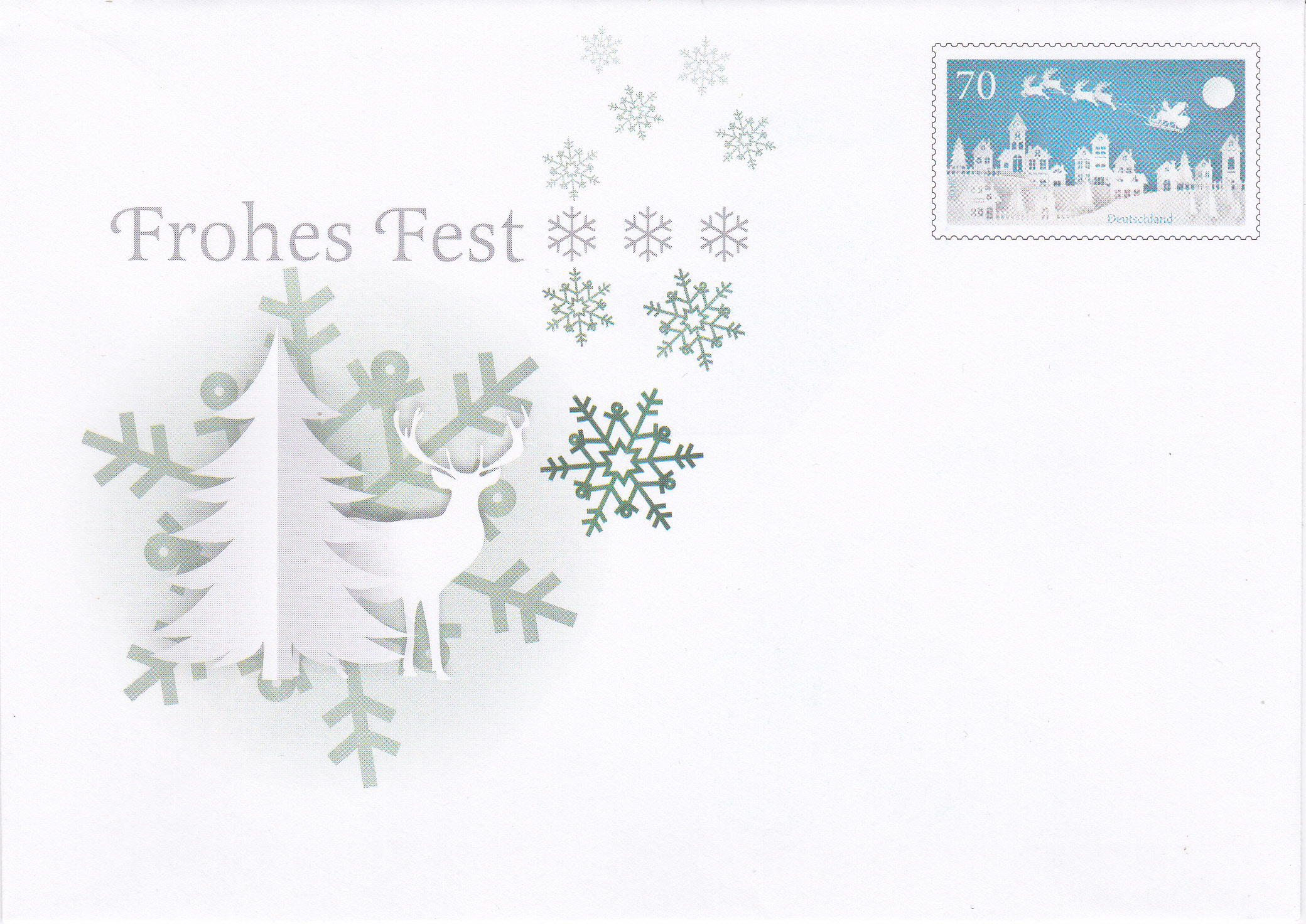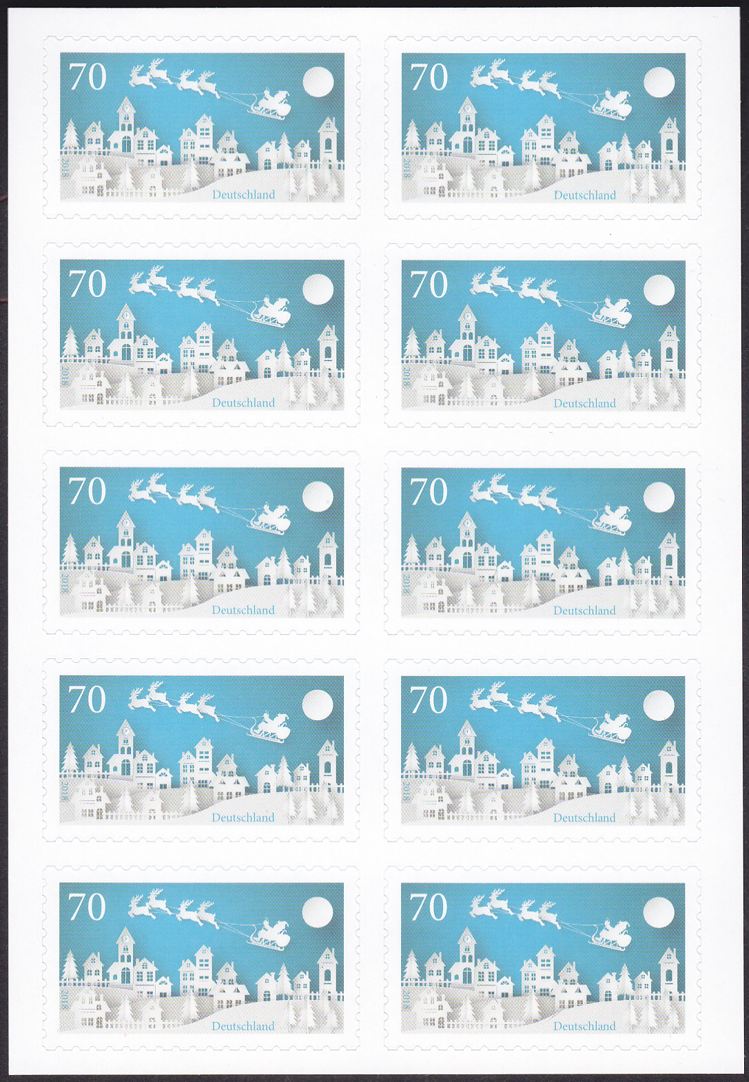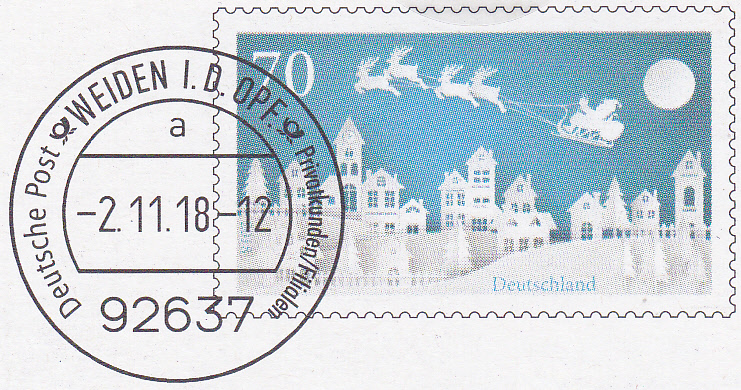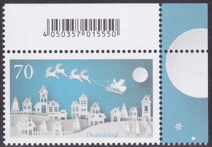 Bei der Post gibt es zur Zeit Plusbriefe mit Wertstempel der 70C-Marke "Winter" mit dem Motiv "Weihnachtsmann im Rentierschlitten über einer Stadt" (MiNr 3421) mit aufgedruckter Zähnung und einer dazu passenden Weihnachtsklappkarte.