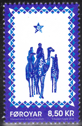 Die Weihnachtsmarke 2015 zu 8,50 Kronen aus Dänemark Färöer (MiNr 844) zeigt die Hl. Drei Könige auf Kamelen nach einer Illustration von Edward Føgle (geb. 1965, Maler, Graphiker und Bühnenbildner).