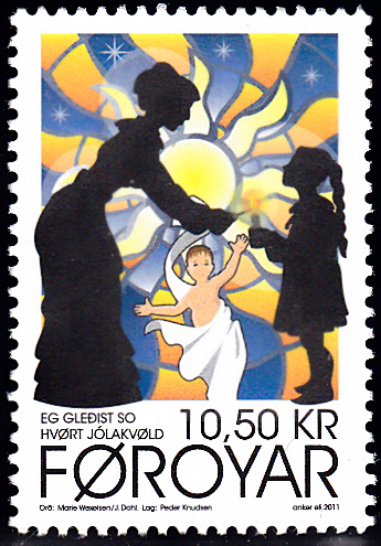 Die Weihnachtsmarken 2011 aus Dänemark Färöer erschienen zum Thema "Weihnachtslieder". Hier die Marke zu 6,50 Kronen (MiNr 736) mit einer Illustration zu dem Weihnachtslied "Eg eri so sepent til jóla (Ich bin so gespannt auf Weihnachten)" von Ella Smith Clementsen (*1952).