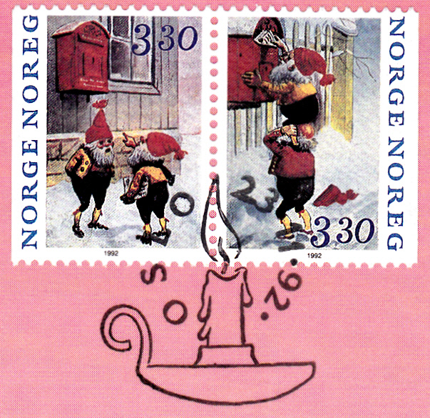 In Norwegen ist 1992 diese Marke (MiNr 1112) mit zwei Weihnachtswichteln unter einem Briefkasten erschienen. Sie beraten offenbar, wie man es schafft, den Brief in den Briefkasten zu werfen.