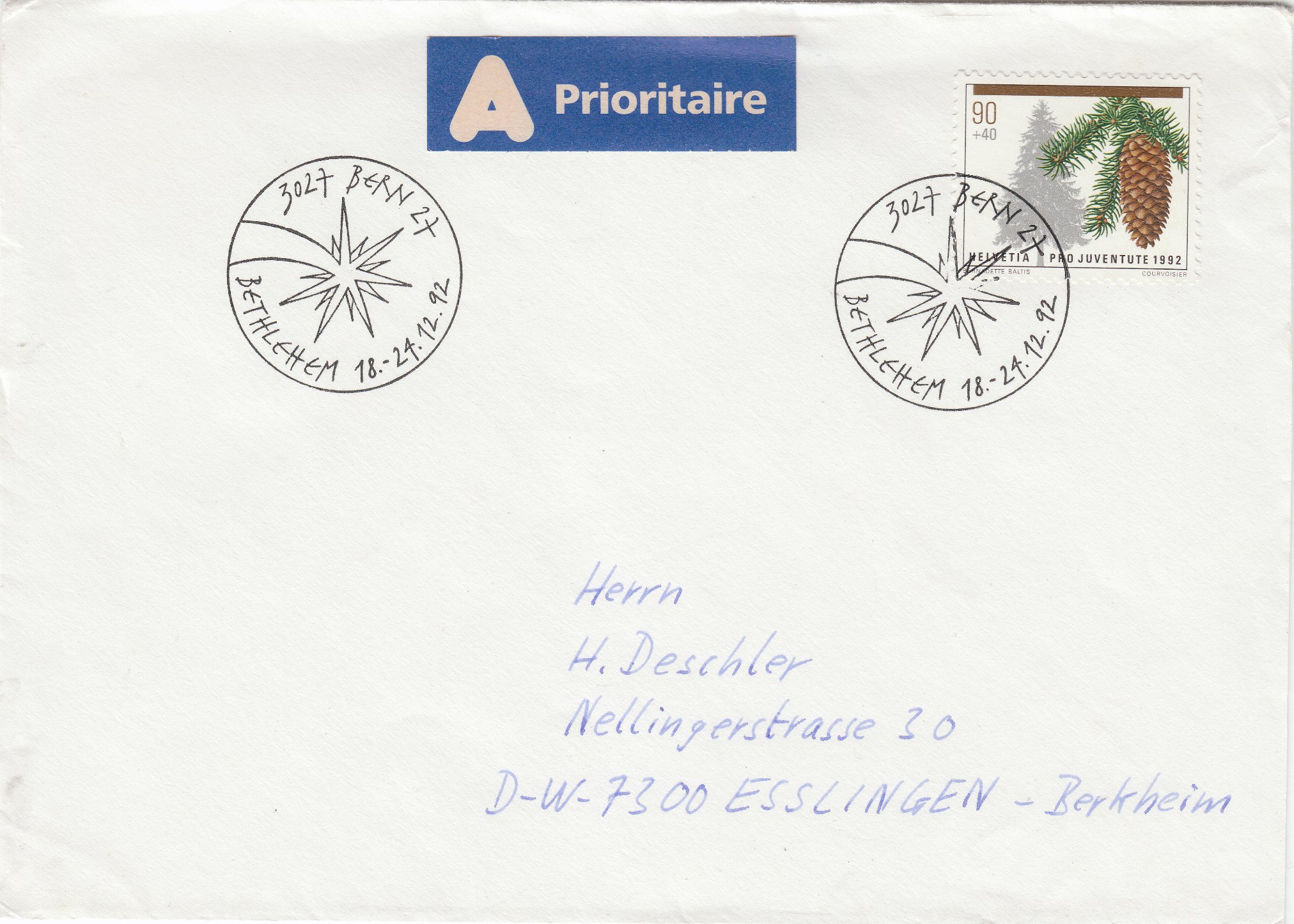 Der Stern von Bethlehem ist 1992 das Thema des Poststempels auf diesem Beleg aus der Schweiz: