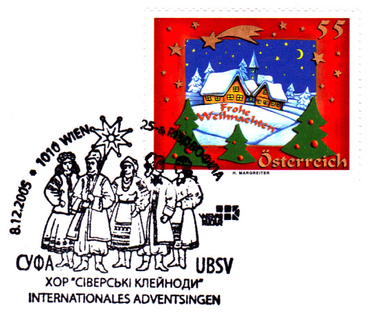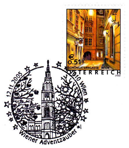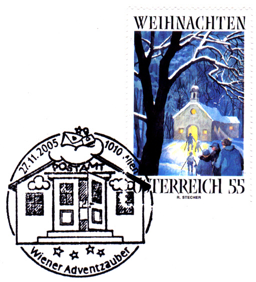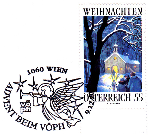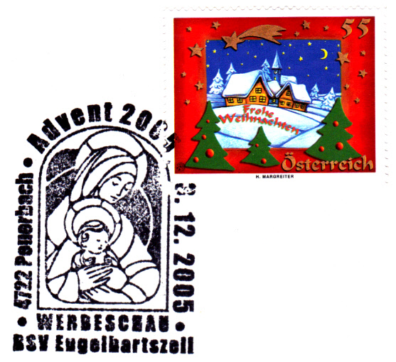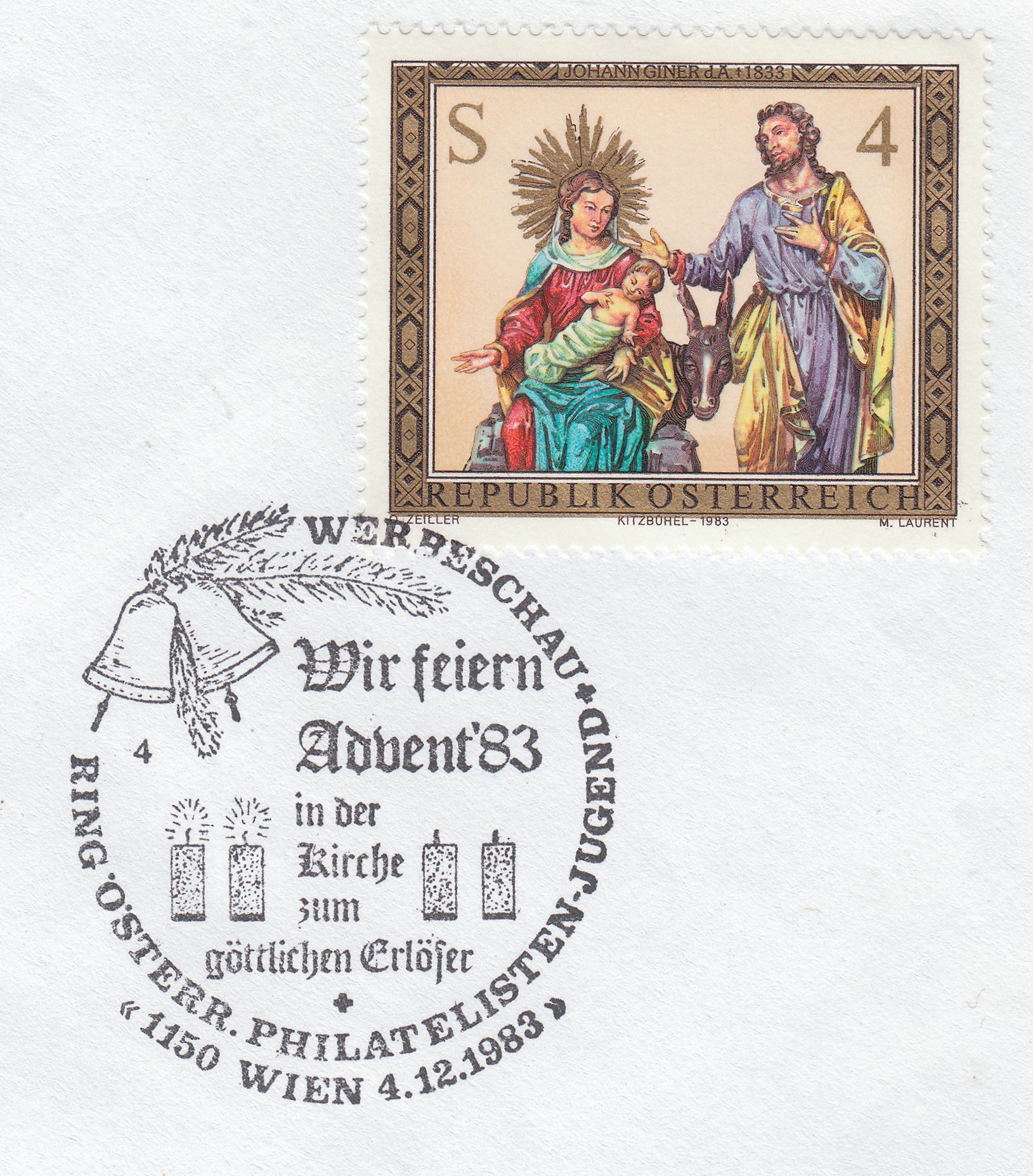Der Sonderstempel zum Weihnachtsmarkt in Essen macht mit einem Adventskranz auf den 4. Advent aufmerksam:
