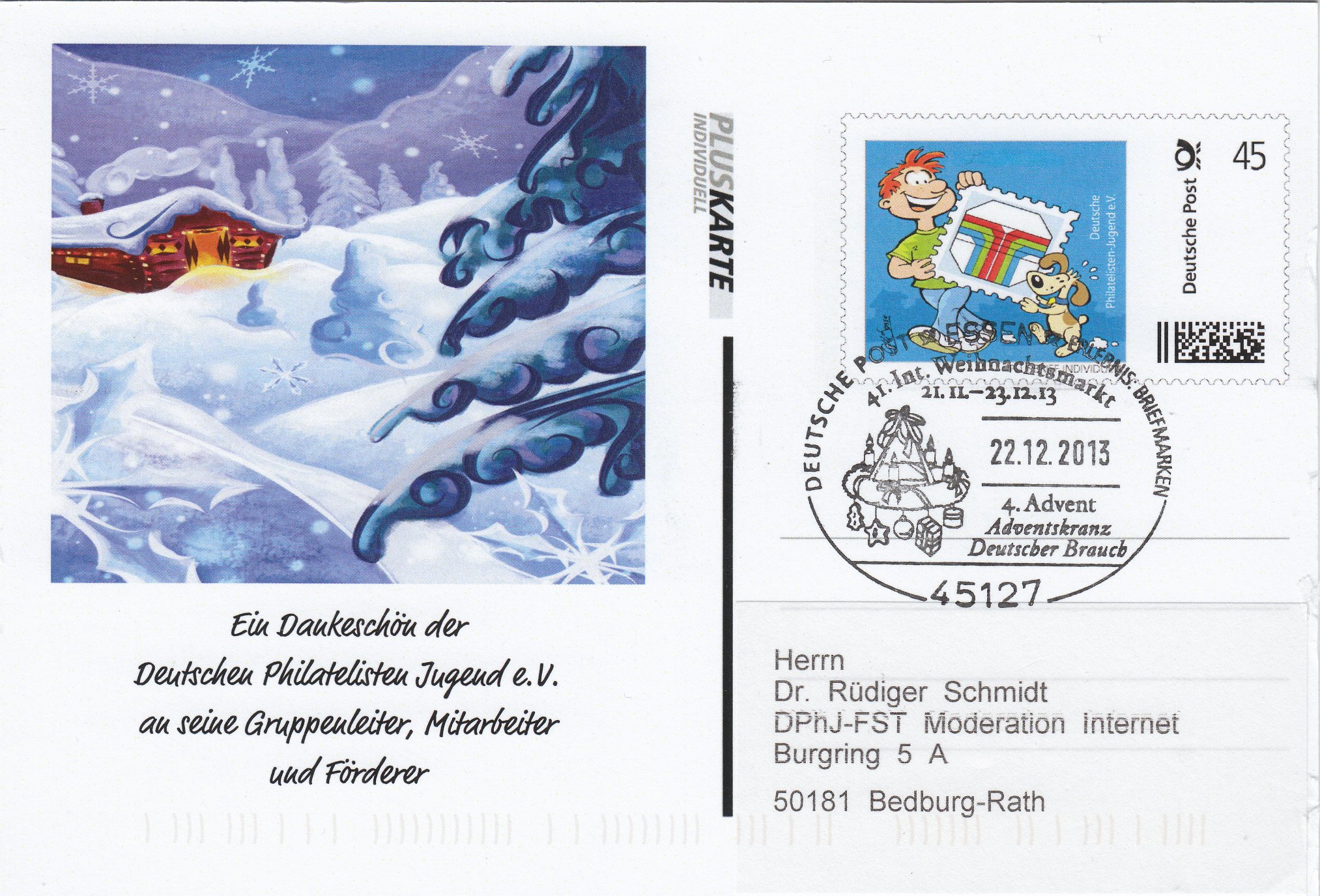 Per dieser Pluskarte erhielten die Gruppenleiter, Mitarbeiter und Förderer der Deutschen Philatelisten Jugend e.V. in diesem Jahr ein kleines Dankeschön.