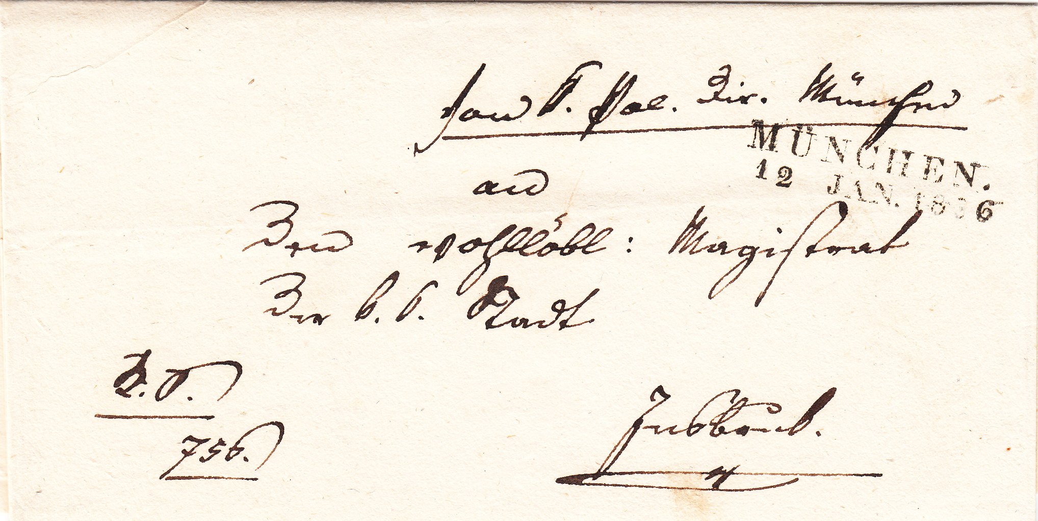 Bei diesem Beleg handelt es sich um eine Dienstsache von der Polizeidirektion München nach Innsbruck, aufgegeben am 12.01.1836: