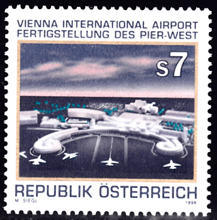 Zur Fertigstellung des West-Terminals des Internationalen Flughafens Wien ist in Österreich eine Marke (MiNr 2180), die den Zentralbereich des Flughafens zeigt.