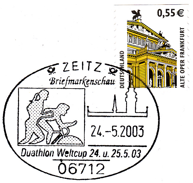 Sonderstempel vom 24.5.2003 aus Zeitz zu einer Briefmarkenschau beim Duathlon Weltcup am 24./25.5.2003. Im Stempelbild werden die beiden Disziplinen dargestellt.