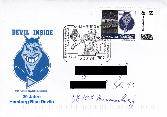 Der Ersttagsstempel zeigt das Spielgerät, einen Football.