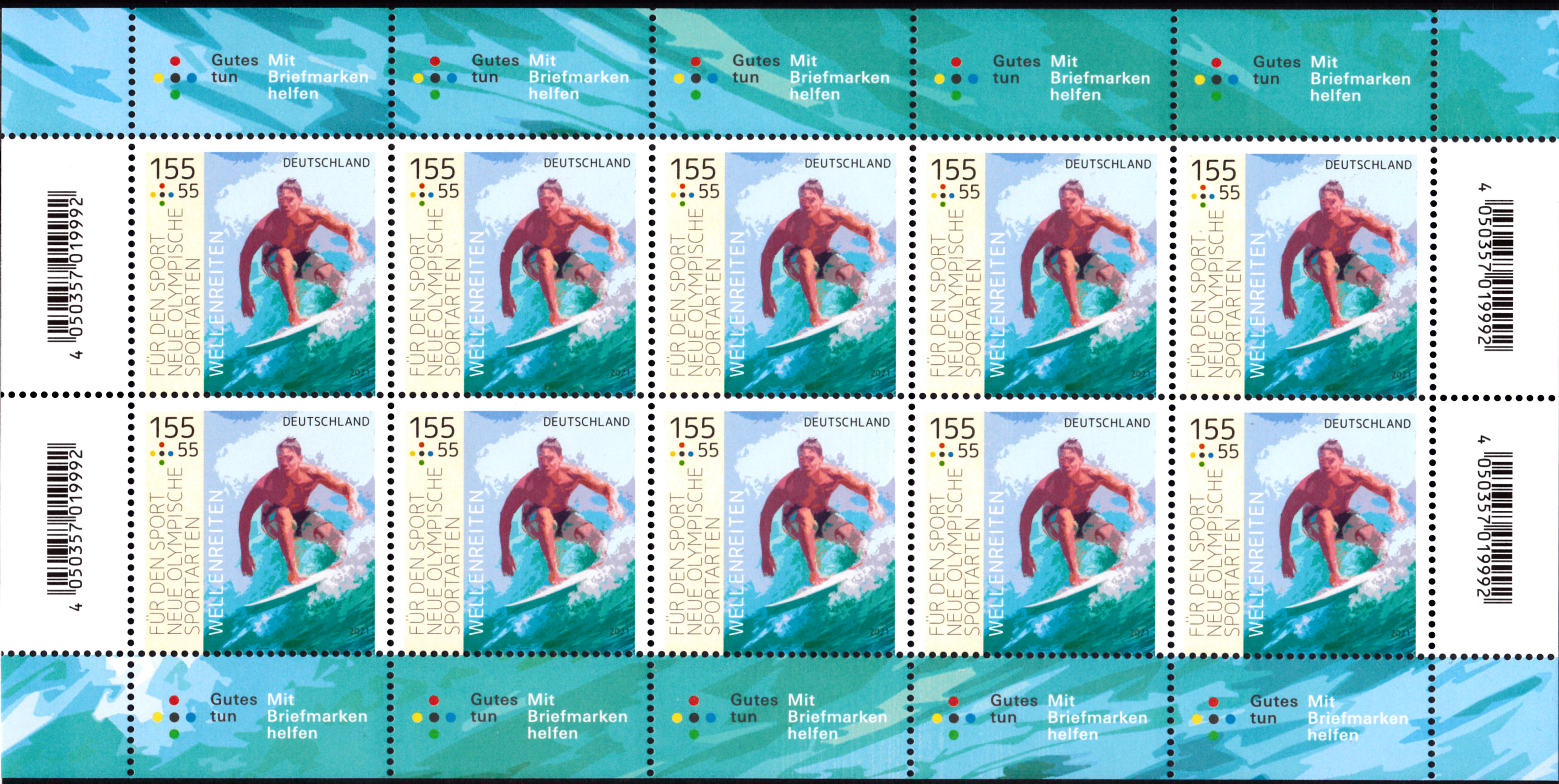 Auf dieser Marke (MiNr 3604) der Serie "Für den Sport" 2021 der Deutschen Post wird einen Surfer abgebildet.