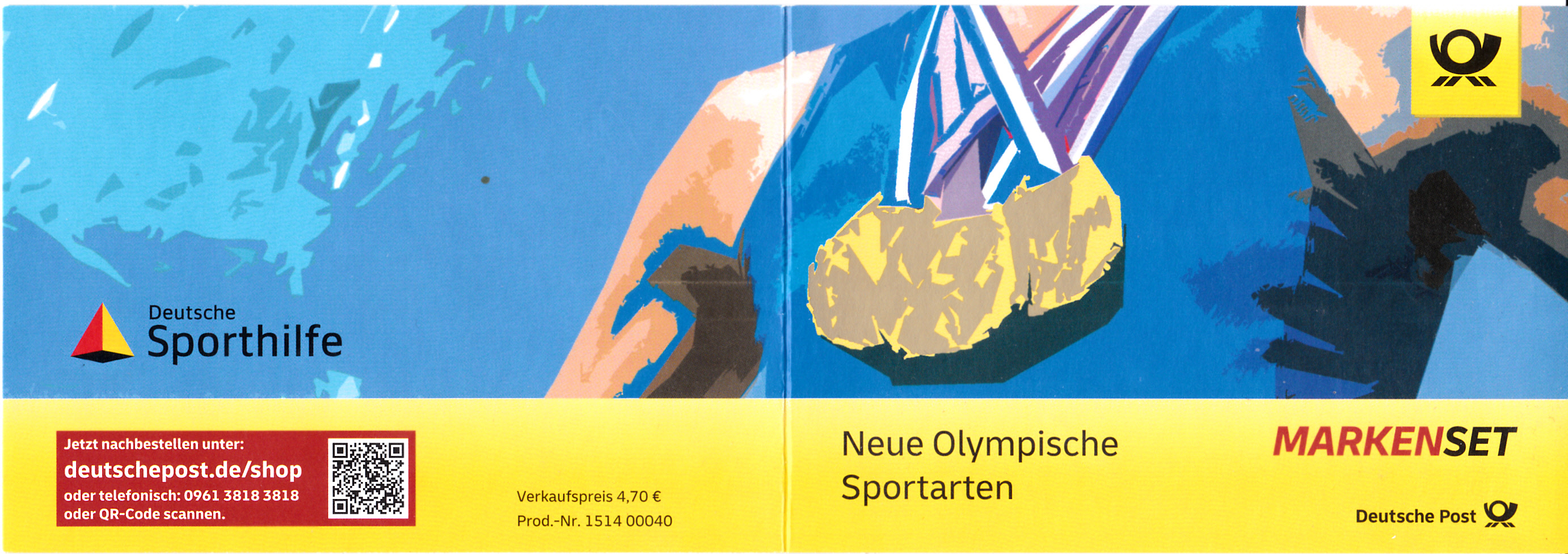 Klappkarte des Vorstandsvorsitzenden der Deutschen Post AG mit je einer Marken der Sporthilfemarkenserie 2020 (MiNr 3542 bis 3544) mit Motiven zum Thema "Neue olympische Sportarten" dem Ersttagsonderstempel Bonn.