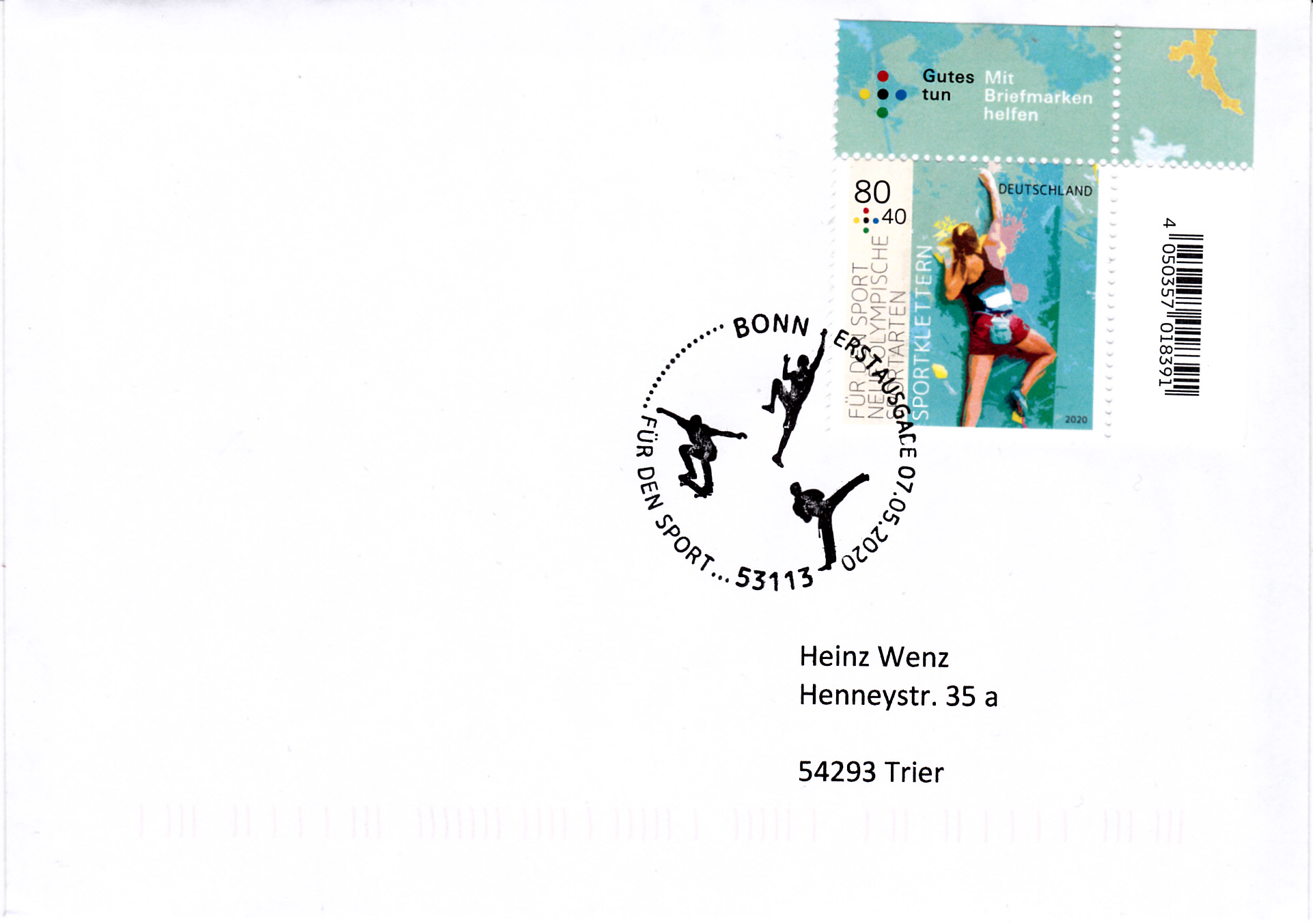 Brief vom Ersttag mit der Marke (MiNr 3542) zur neuen olympischen Sportart Sportklettern mit dem Ersttagsonderstempel aus Bonn. Auch im Stempel wird ein Sportkletterer gezeigt.