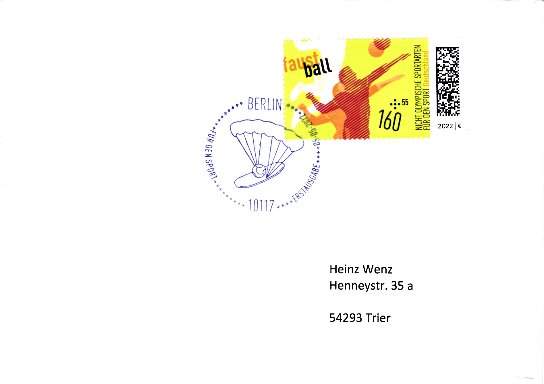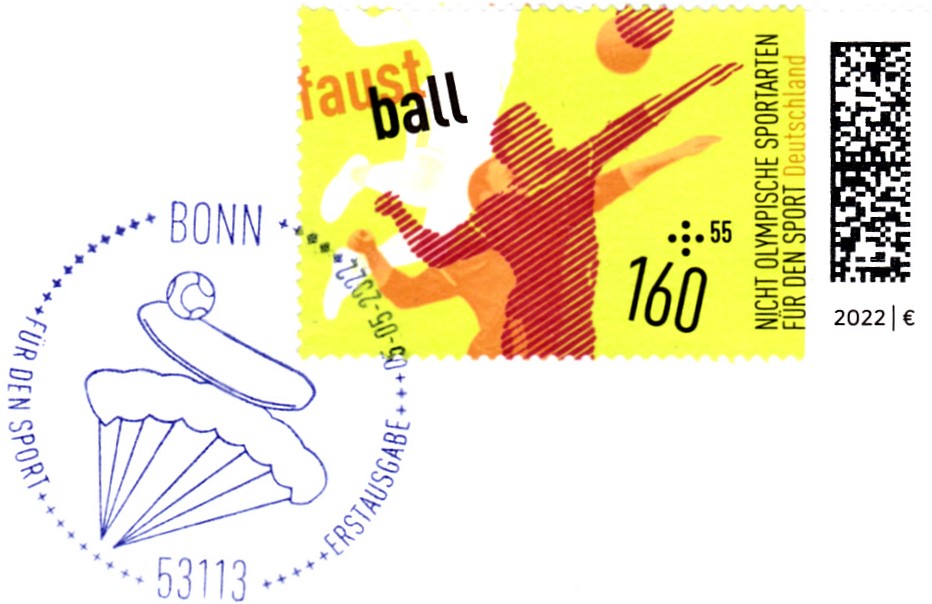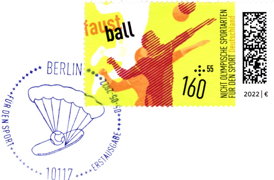 In der Serie "Für den Sport" 2022 mit nicht olympischen Sportarten gibt es auch eine Marke (MiNr 3686) zum Thema "Faustball". Hier zeige ich eine Marke vom Eckrand mit EAN-Codierung.