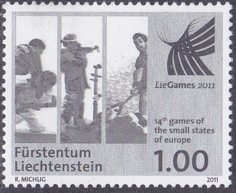 Zu den 14. Sportspiele der europäischen Kleinstaaten in Schaan erschien in Liechtenstein diese Marke (MiNr 1583) mit der Abbildung eines Judoka, eines Schützen und eines Squashspielers.