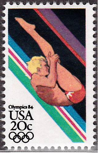 Zu den Olympischen Spielen 1984 in Los Angeles erschien in den USA auch eine Marke mit einem Wasserspringer im Markenbild (MiNr 1690).