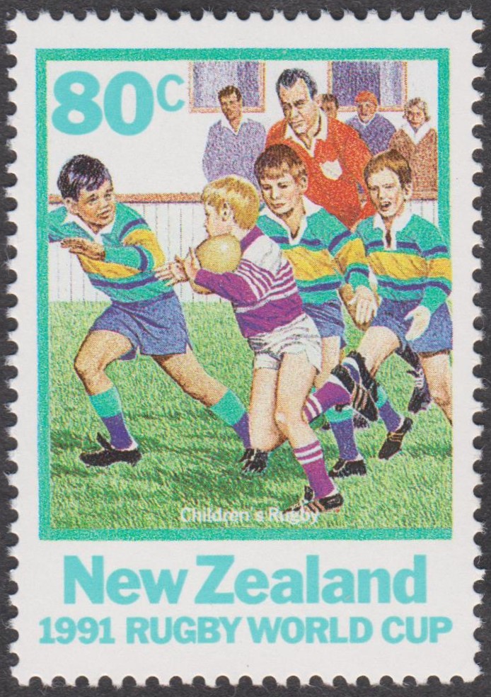 1991 erschien in Neuseeland dieses Postwertzeichen, das Kinder beim Rugby zeigt: