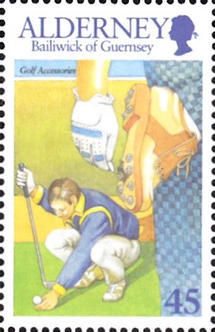 Auf der nächsten Marke dieser Serie (MiNr 175) sehen wir einen Golfspieler aus der Golfanlage des Golfklubs von Alderney (gegründet 1970).