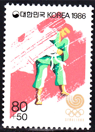 Eine Marke (MiNr 1483) der Ausgaben aus Südkorea zu den Olympischen Spielen 1988 in Seoul zeigt zwei Judoka beim Kampf.