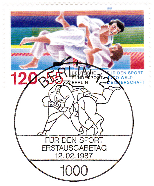 1987 erschien in Berlin in der Serie "Für den Sport" eine Marke (MiNr 778) zu den Judo-Weltmeisterschaften in Essen ein Marke mit einer Kampfszene beim Judo. Hier ein Exemplar mit dem motivlich dazu passenden Ersttagsonderstempel aus Berlin.