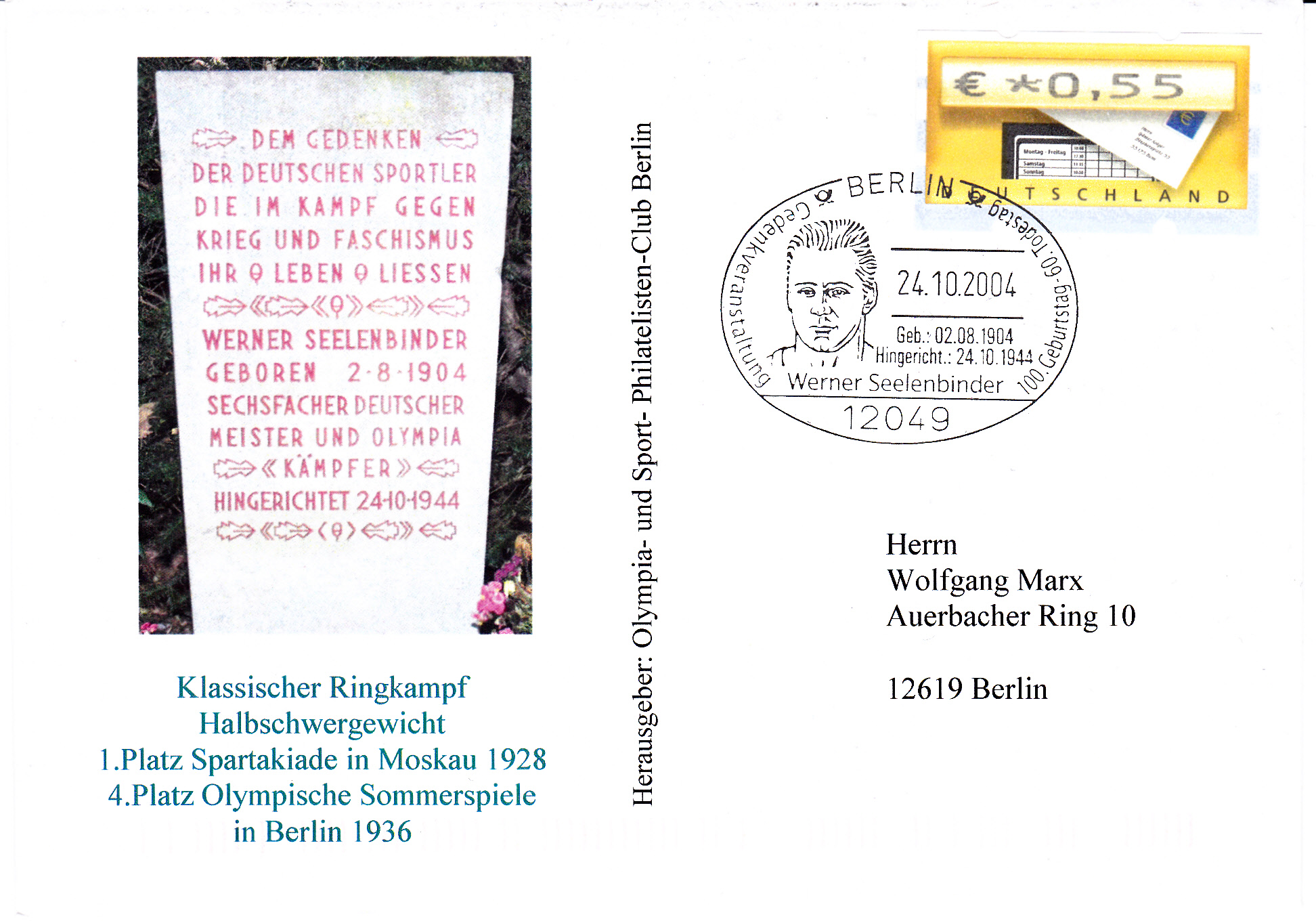 Sonderstempel aus Berlin vom 24.10.2004 zum 100. Geburtstag und 60. Todestag von Werber Seelenbinder mit seinem Porträt im Stempelbild. Auf dem Umschlag wird der Grabstein seines Grab im Werner-Seelenbinder-Sportpark, wo seine Urne beigesetzt ist.