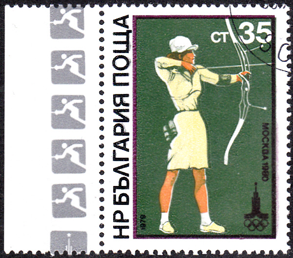 Diese Marke zu den Olympischen Spielen 1980 in Moskau aus Jugoslawien (MiNr 1827) zeigt einen Teil eines Bogens und der Arme eines Bogenschützen.