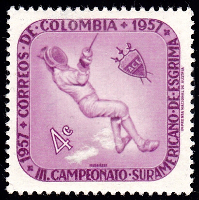 In Kolumbien erschien zu den 3. südamerikanische Meisterschaft im Florettfechten 1957 diese Marke (MiNr 824) mit einem Florettfechter im Markenbild.