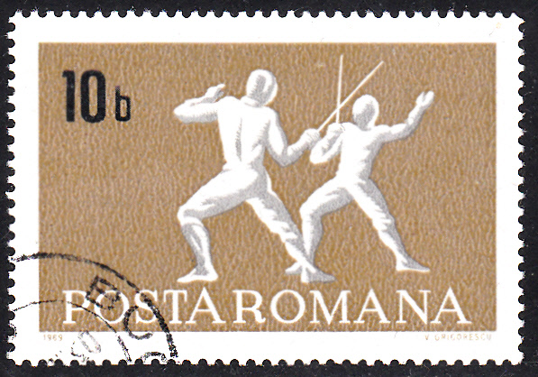 Zwei Fechter kämpfen auf dieser Marke aus Rumänien (MiNr 2747).