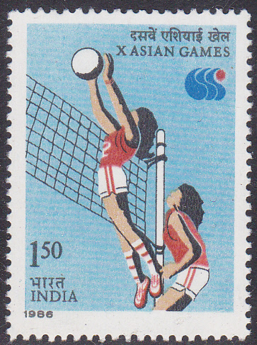 Zu den Asien-Spielen 1986 ist in Indien diese Marke (MiNr 1061) mit einer Spielszene am Netz beim Volleyball erschienen.