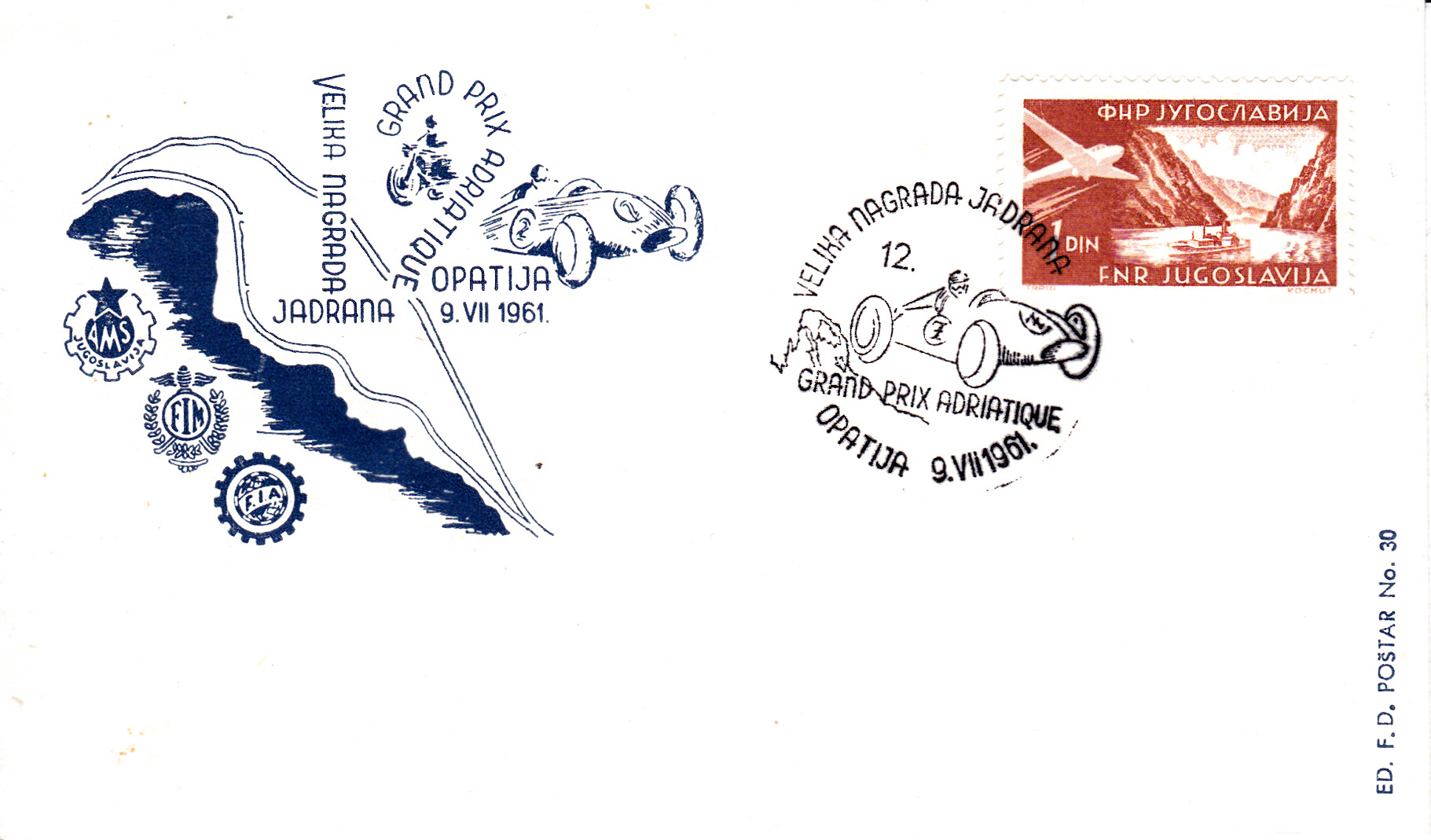 Sonderstempel aus Opatija vom 9.7.1961 zum Grand Prix Adriatique (Großer Preis der Adria) mit einem Rennwagen im Markenbild.