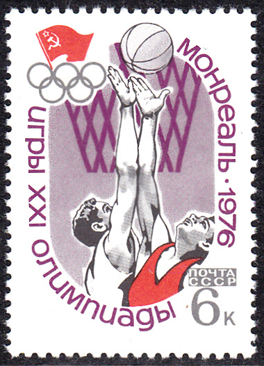 Auf dieser Marke (MiNr 4479) aus der Serie der Sowjetunion zu den Olympischen Sommerspielen 1976 sind zwei Basketballspieler beim Kampf um den Ball unter dem Korb zu sehen.