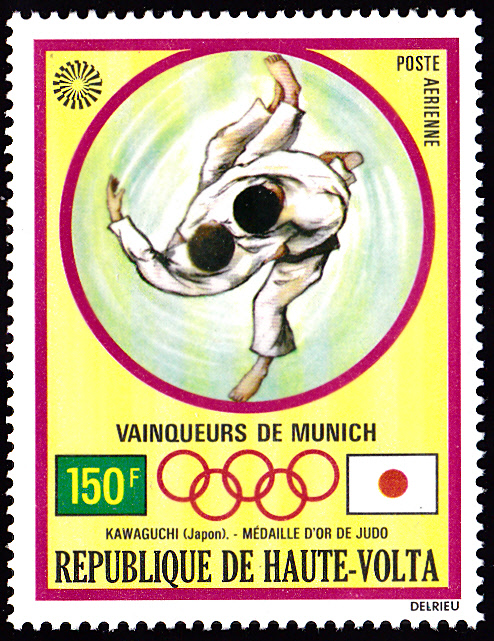 Diese Marke aus Obervolta ist zum Olympiasieg 1972 durch den japanischen Judoka Takao Kawaguchi beim Judo im Leichtgewicht erschienen.