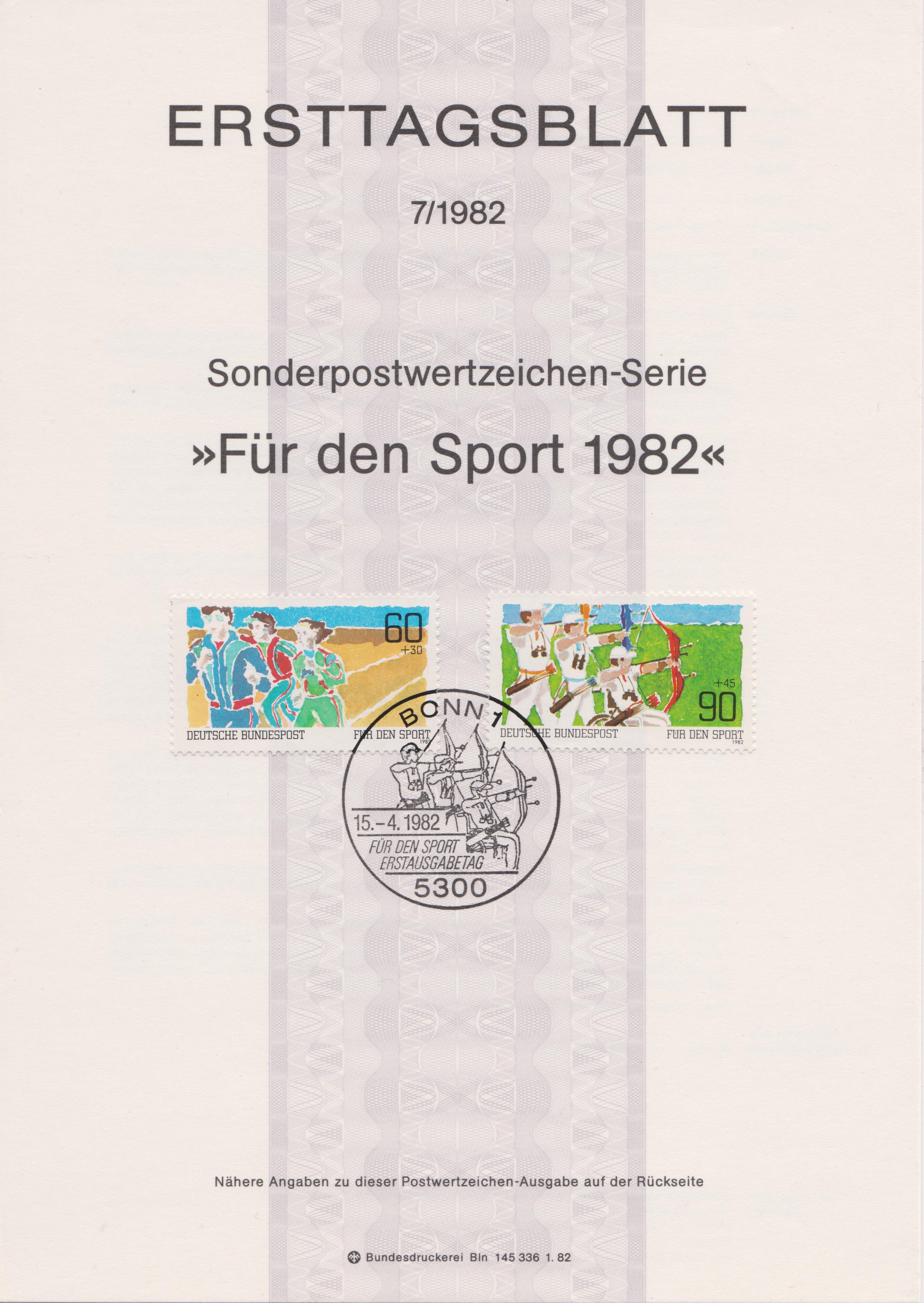 Bund MiNr. 1128 zeigt das Motiv Bogenschießen, hier auf "ERSTTAGSBLATT", ETB 7/1982, mit zum Motiv passendem Ersttagsstempel: