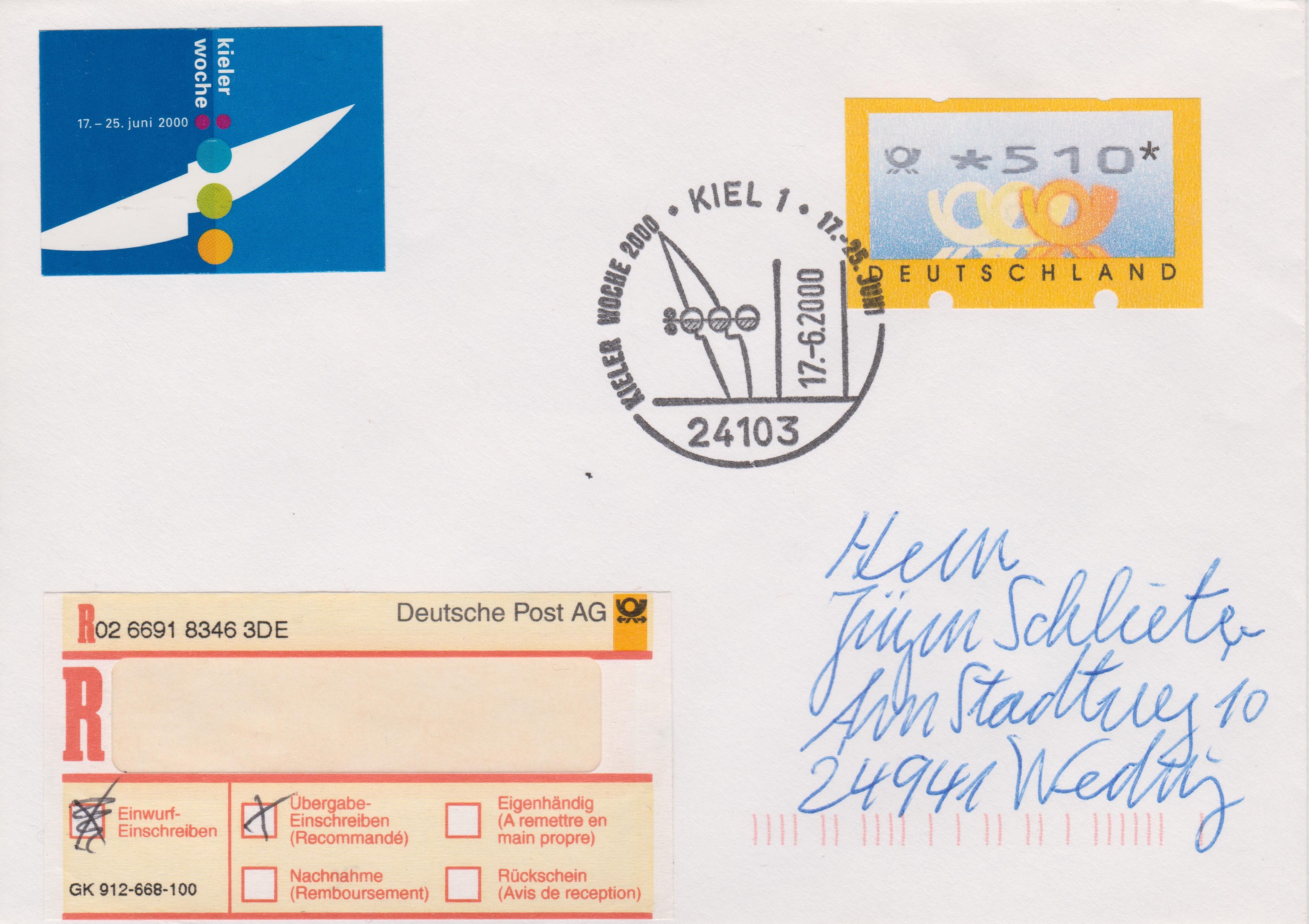 Dieser Standardbrief (110 Pf) per Übergabe-Einschreiben (400 Pf) = Portostufe 510 Pf, dokumentiert an 17.06.2000 per Einzelfrankatur einer Automatenmarke ATM MiNr. 3.2 der Wertstufe 510 Pf, entwertet mit Sonderstempel "24103 KIEL 1" den Eröffnungstag der Kieler Woche 2000: