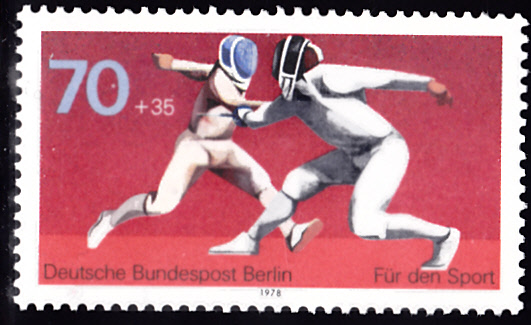 Auf einer Marke aus Berlin (MiNr 568) wird eine Kampfszene beim Fechten gezeigt.