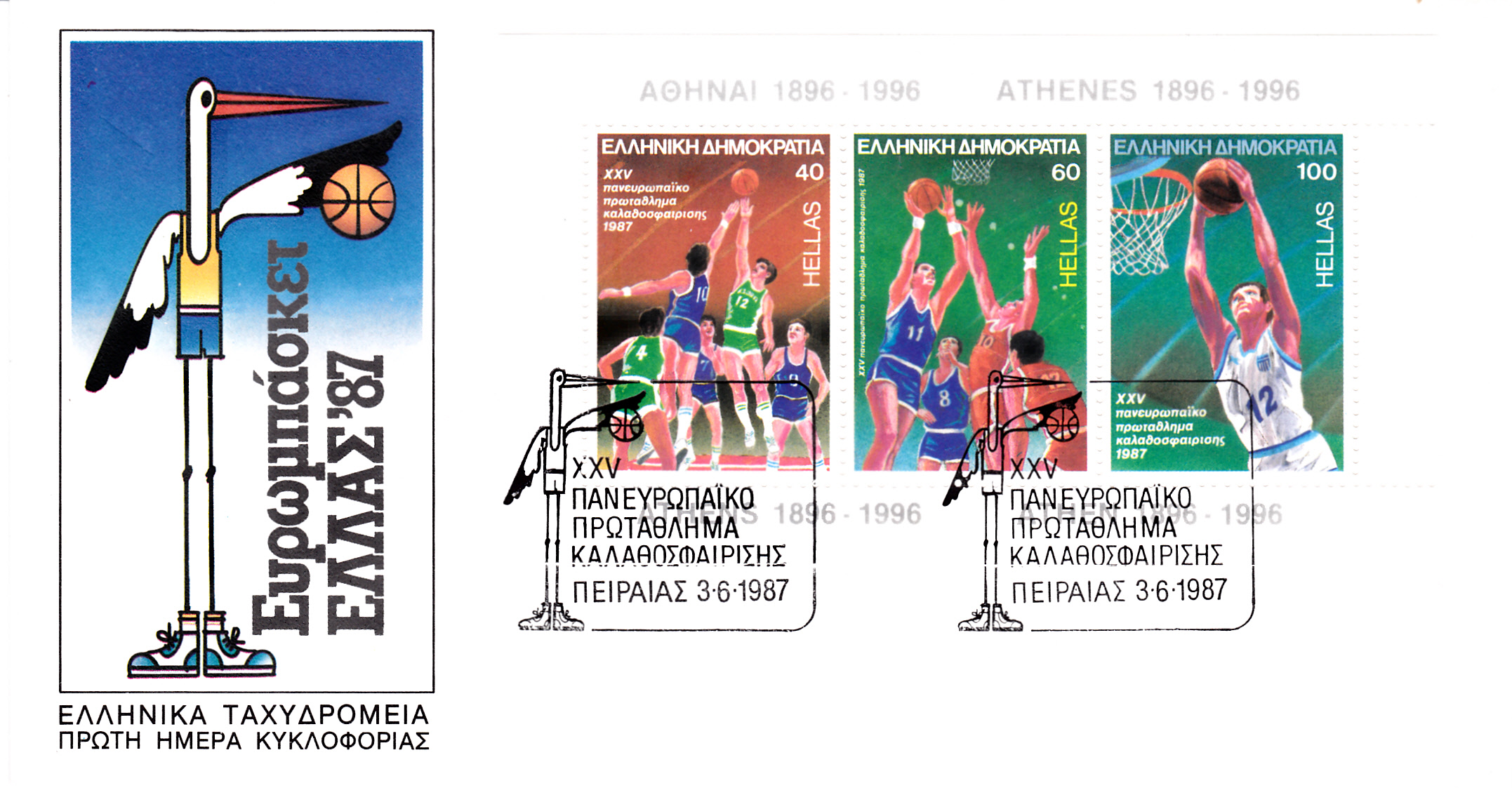 Der bereits hier schon gezeigte Block aus Griechenland (MiNr Block 6) zu den Basketball-Europameisterschaft 1987 in Athen ist hier auf einem FDC mit einem Ersttagsonderstempel entwertet worden.
