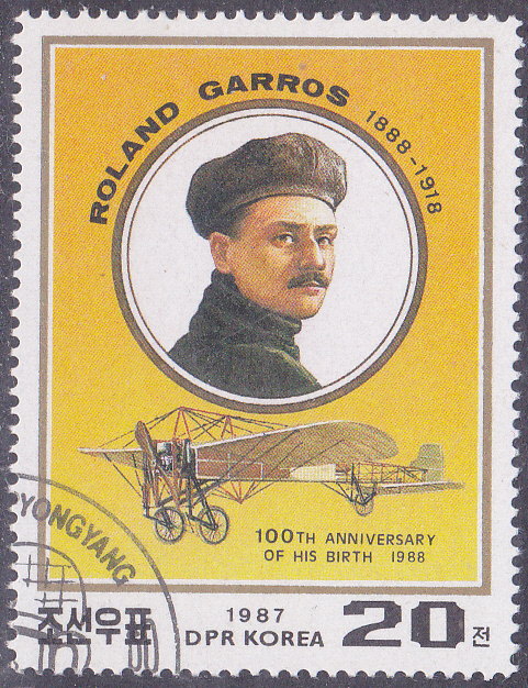 In einer Serie "Tennis" ist in Korea-Nord diese Marke (MiNr 2889) mit einem Porträt von Roland Garros (1888-1918, französischer Pilot) und dem Flugzeug Blériot XI erschienen. Was hat diese Marke mit Tennis zu tun?