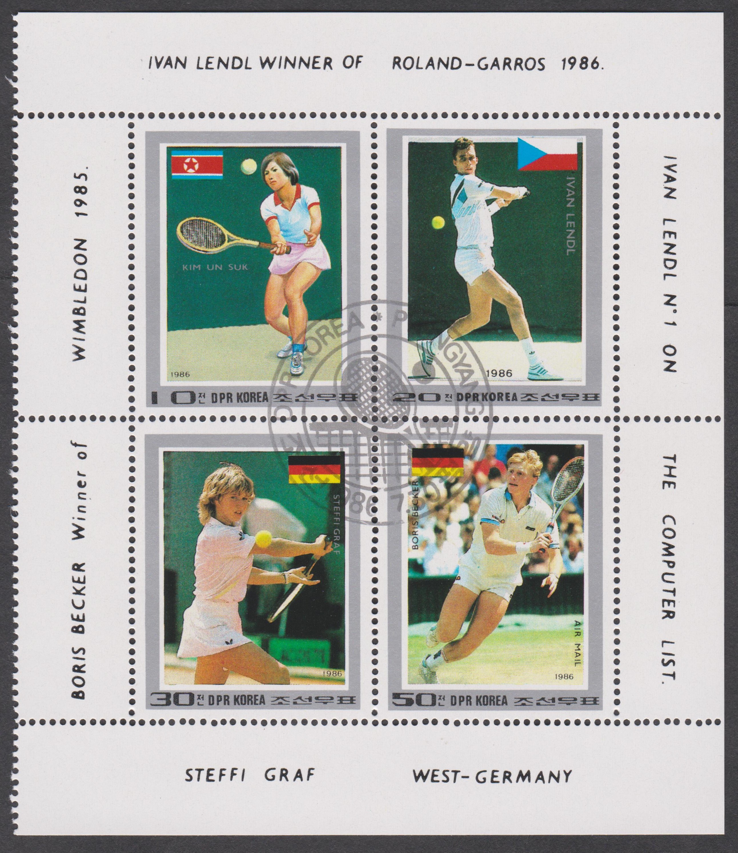 Nordkorea Block 217 mit MiNr. 2755 - 2758 zeigt Kim Un Suk, Ivan Lendl, Steffi graf und Boris Becker: