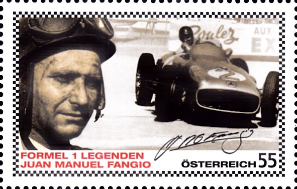 Der hier schon erwähnte Juan Manuel Fangio ist auf dieser Marke aus Österreich (MiNr 2657) abgebildet. Er prägte die Anfangsjahre der Formel 1 und wurde in dieser Klasse fünfmal Weltmeister.
