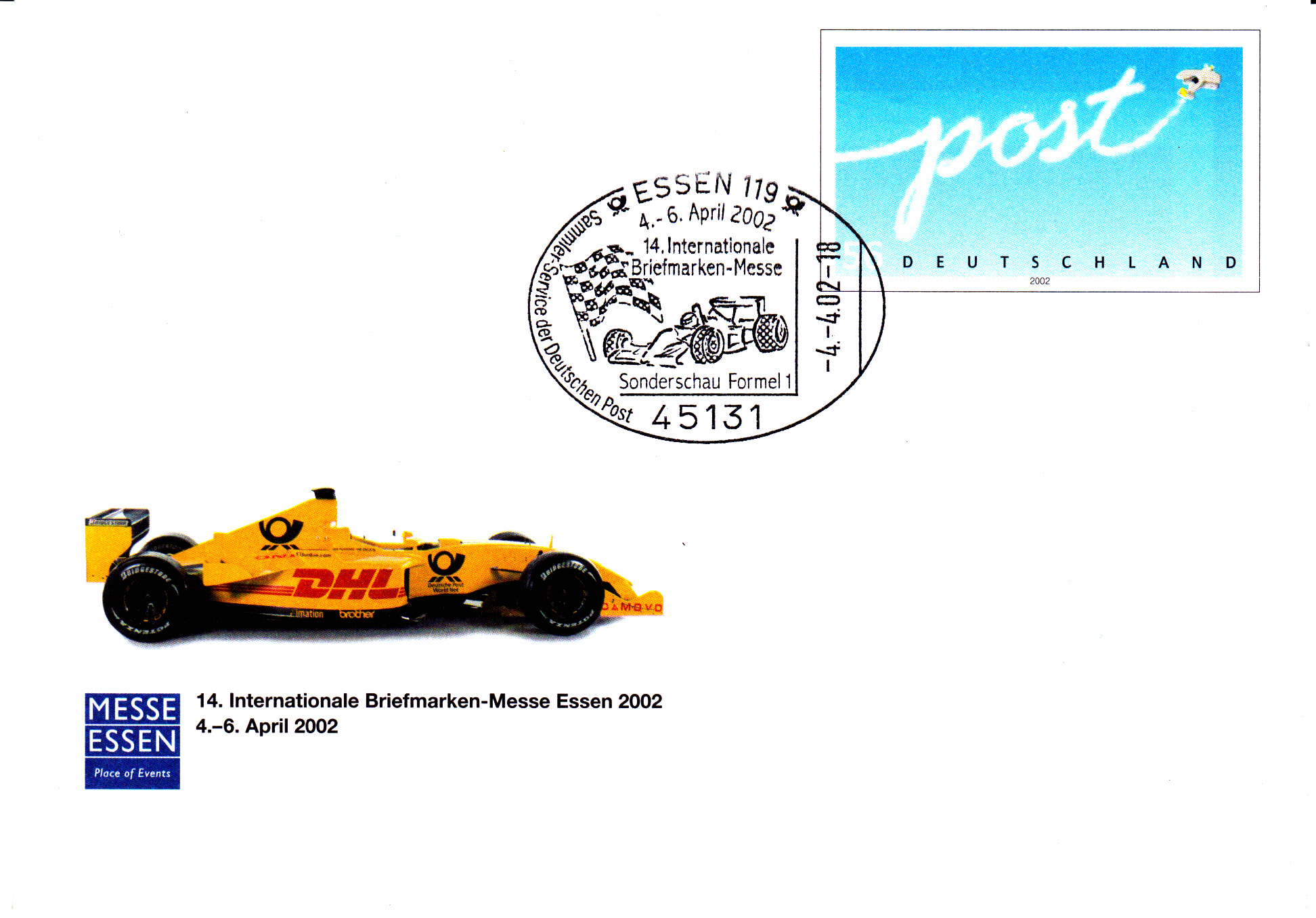In der Rennsaison 2002 war die Deutsche Post World Net mit ihrer Express-Marke DHL in der Formel 1 Sponsor von Jordan Grand Prix. Am 22.2.2002 stellte das DHL-Jordan-Honda Team in Brüssel/Belgien seinen Formel 1 Boliden für die Saison 2002 vor. Sehr wahrscheinlich ist dieses Auto auf dieser Ganzsache zur Messe 2002 und im Stempel abgebildet.