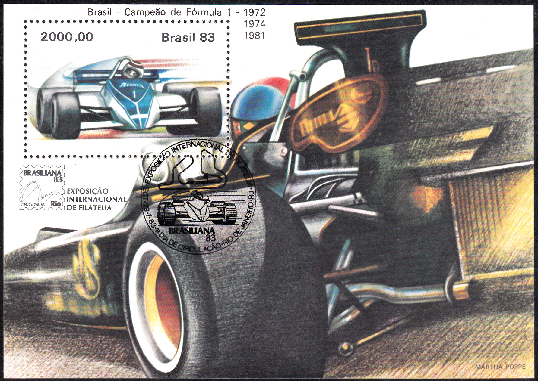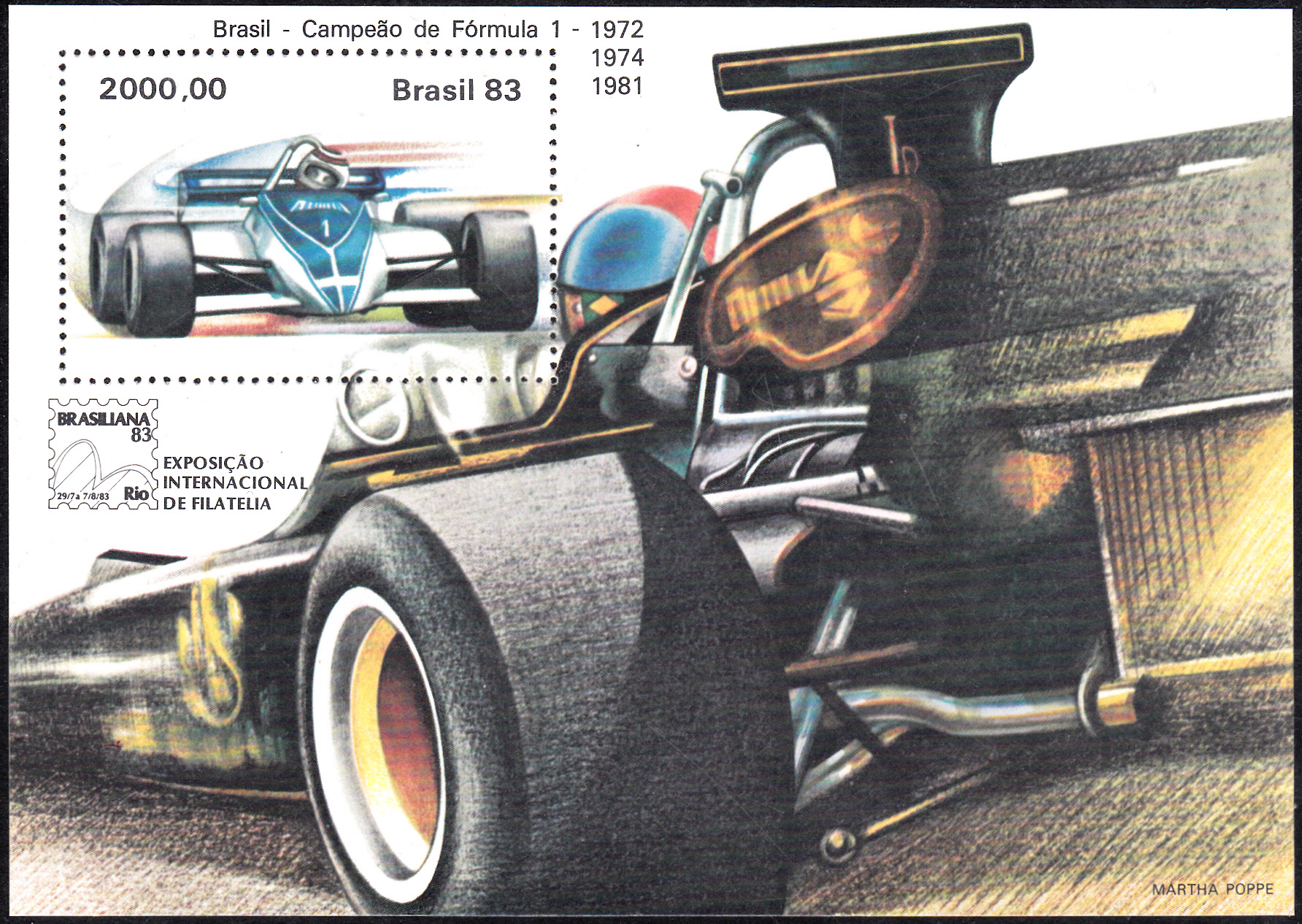 Zur Internationale Briefmarkenausstellung BRASILIANA ‘83 in Rio de Janeiro erschien 1983 auch ein Block mit der Abbildung eines Formel 1 Rennautos. Mit diesem Block wurde der Gewinn der Weltmeisterschaft 1972 und 1974 durch den Brasilianer Emerson Fittipaldi und den Brasilianer Nelson Piquet 1981 gewürdigt. Piquet gewann danach noch zwei Titel (1983 und 1987).
