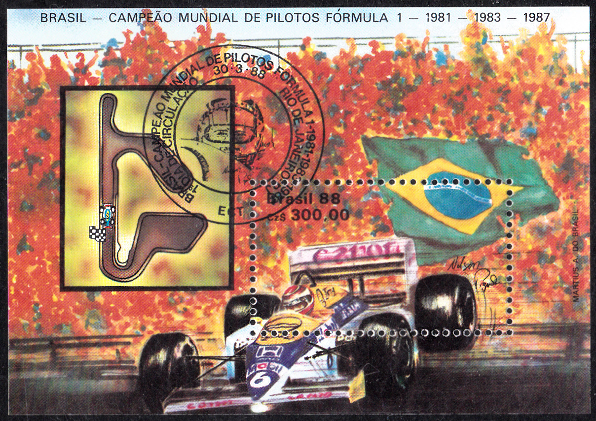 Zum Formel-1-Weltmeisterschaftslauf in Rio de Janeiro erschien in Brasilien1988 dieser Block. Er zeigt einen Williams-Honda-Rennwagen, die brasilianische Landesflagge, eine Unterschrift von Nelson Piquet und die Rennstrecke in Rio. Er erinnert im Text an die drei Weltmeistertitel von Piquet (1981, 1983 und 1987).