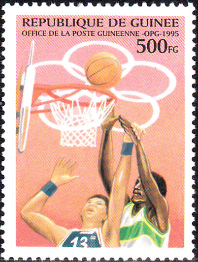 Auf dieser Marke aus Guinea (MiNr 1523) zu den Olympischen Sommerspiele 1996 in Atlanta sehen wir zwei Basketballspieler unter dem Korb.