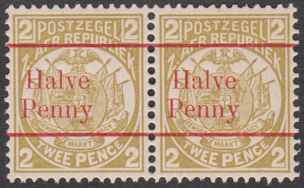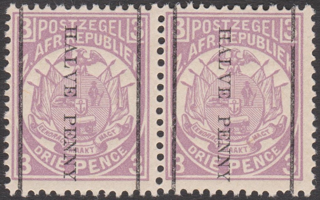 Transvaal MiNr. 31 b erschien 1893, indem die Freimarke Transvaal MiNr. 15 mit einem Aufdruck des neuen Wertes Halve Penny in Rot versehen wurde.
