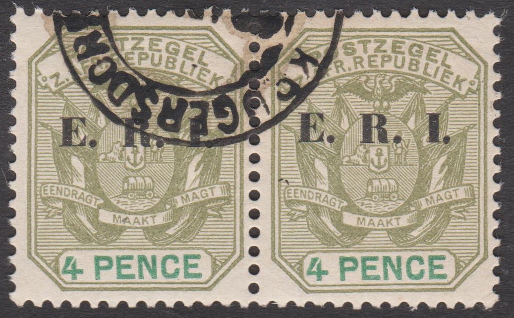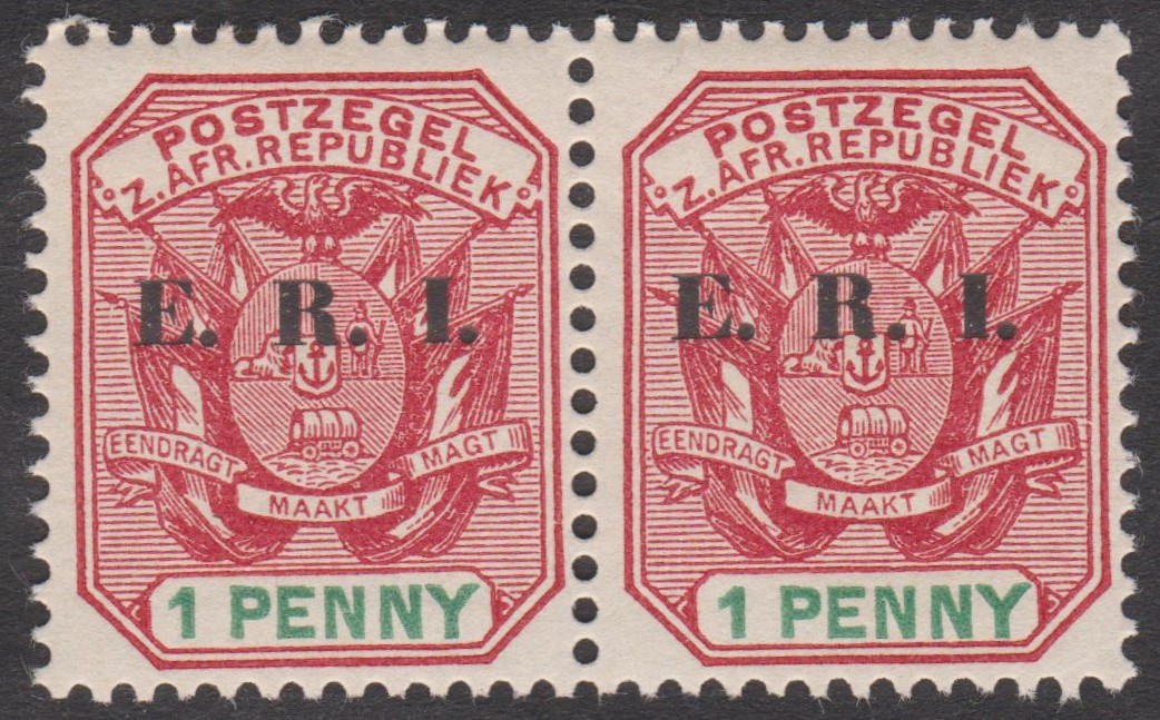 Transvaal MiNr. 96 erschien im Juli 1901, indem die Freimarke Transvaal MiNr. 48 mit einem Aufdruck E. R. I. versehen wurde. E. R. I. steht für Eduardus Rex Imperator.