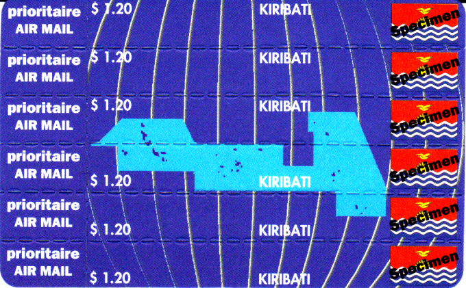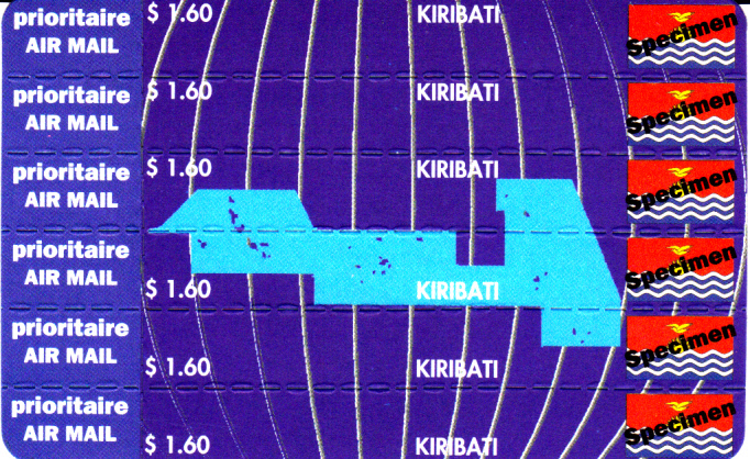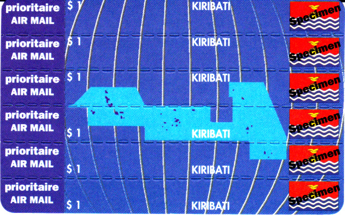 Hier zeige ich eine vermutlich im November 1993 in Kiribati erschienene Stampcard. Diese Konfektionierungsform wurde von einer schwedischen Firma mit dem Namen "PostLine (International) AB" entwickelt und verschiedenen Postverwaltungen unter dem Namen "STAMPCARD TM" angeboten. Die Stampcards haben die Größe der damals häufig benutzten Telefonkarten und konnten somit auch über die gleichen Automaten verkauft werden. Die Stampcard zeigt die Abbildung einer "Landkarte" (oder besser Seekarte mit einzelnen Landflecken, den Inseln) von Kiribati und der Flagge (vermutlich ursprünglich MiNr 631-636). Die 6 waagerechten Markenstreifen sind selbstklebend und auf einem Träger aufgebracht. Links von jeder Marke befindet sich ein abtrennbares Feld mit Angabe der Versendungsart "economique". Beim hier gezeigten Exemplar handelt es sich um eine Musterkarte, erkennlich am Aufdruck "Specimen" über den Flaggen der Marken. Die Stampcard und die Marken sind inzwischen nicht mehr im Michelkatalog verzeichnet (die MiNr 631 bis 654 gibt es nicht mehr), offenbar weil der amtliche Charakter nicht eindeutig zu sein scheint. Die Machart der Stampcard ist ähnlich der von mir unter Korea-Nord eingestellten Stampcard.